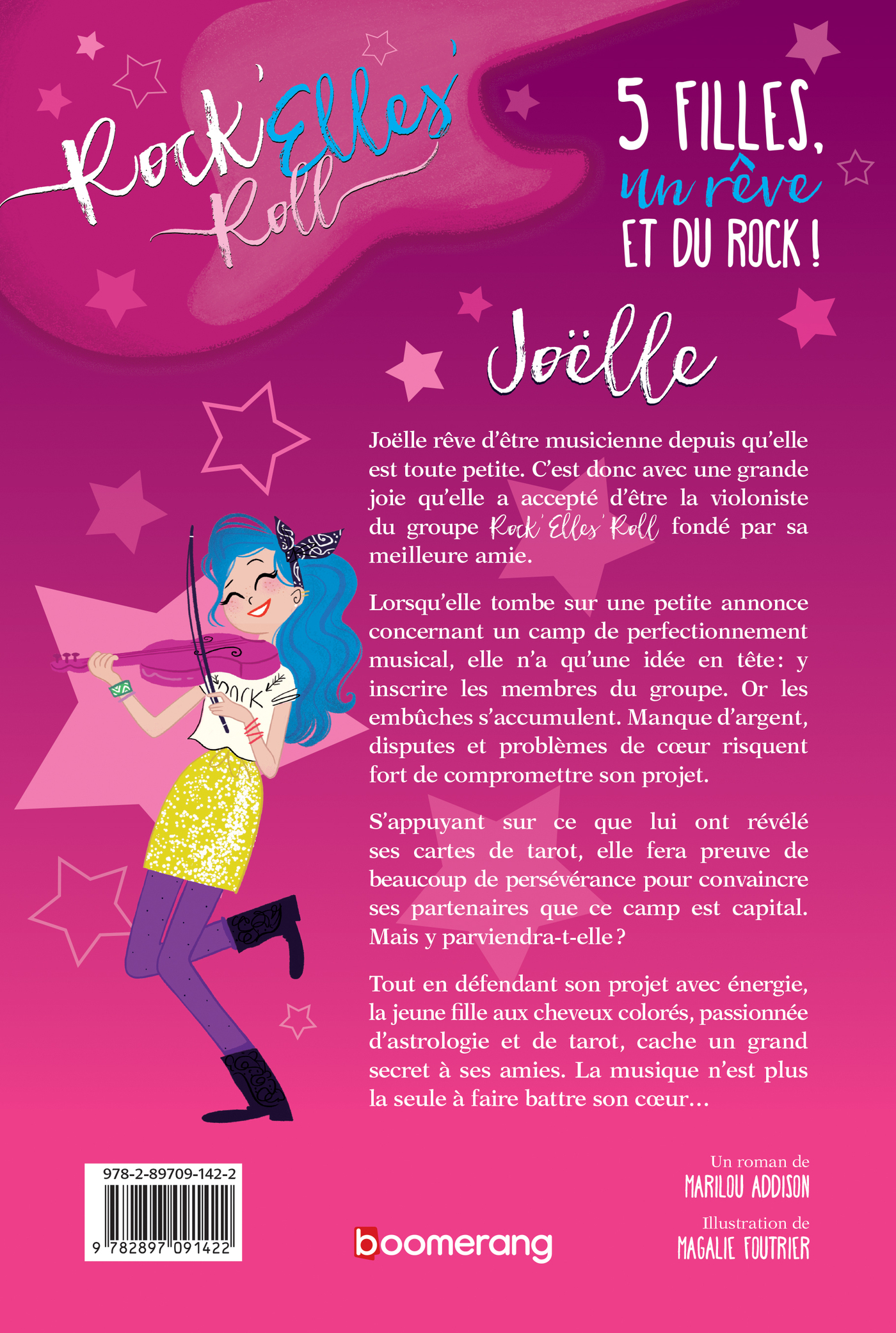 Joëlle rêve d’être musicienne depuis qu’elle est toute petite. C’est donc avec une grande joie qu’elle a accepté d’être la violoniste du groupe Rock’Elles’Roll fondé par sa meilleure amie. Lorsqu’elle tombe sur une petite annonce concernant un camp de perfectionnement musical, elle n’a qu’une idée en tête : y inscrire les membres du groupe. Or les embûches s’accumulent. Manque d’argent, disputes et problèmes de coeur risquent fort de compromettre son projet.S’appuyant sur ce que lui ont révélé ses cartes de tarot, elle fera preuve de beaucoup de persévérance pour convaincre ses partenaires que ce camp est capital. Mais y parviendra-t-elle? Tout en défendant son projet avec énergie, la jeune fille aux cheveux colorés, passionnée d’astrologie et de tarot, cache un grand secret à ses amies. La musique n’est plus la seule à faire battre son coeur…