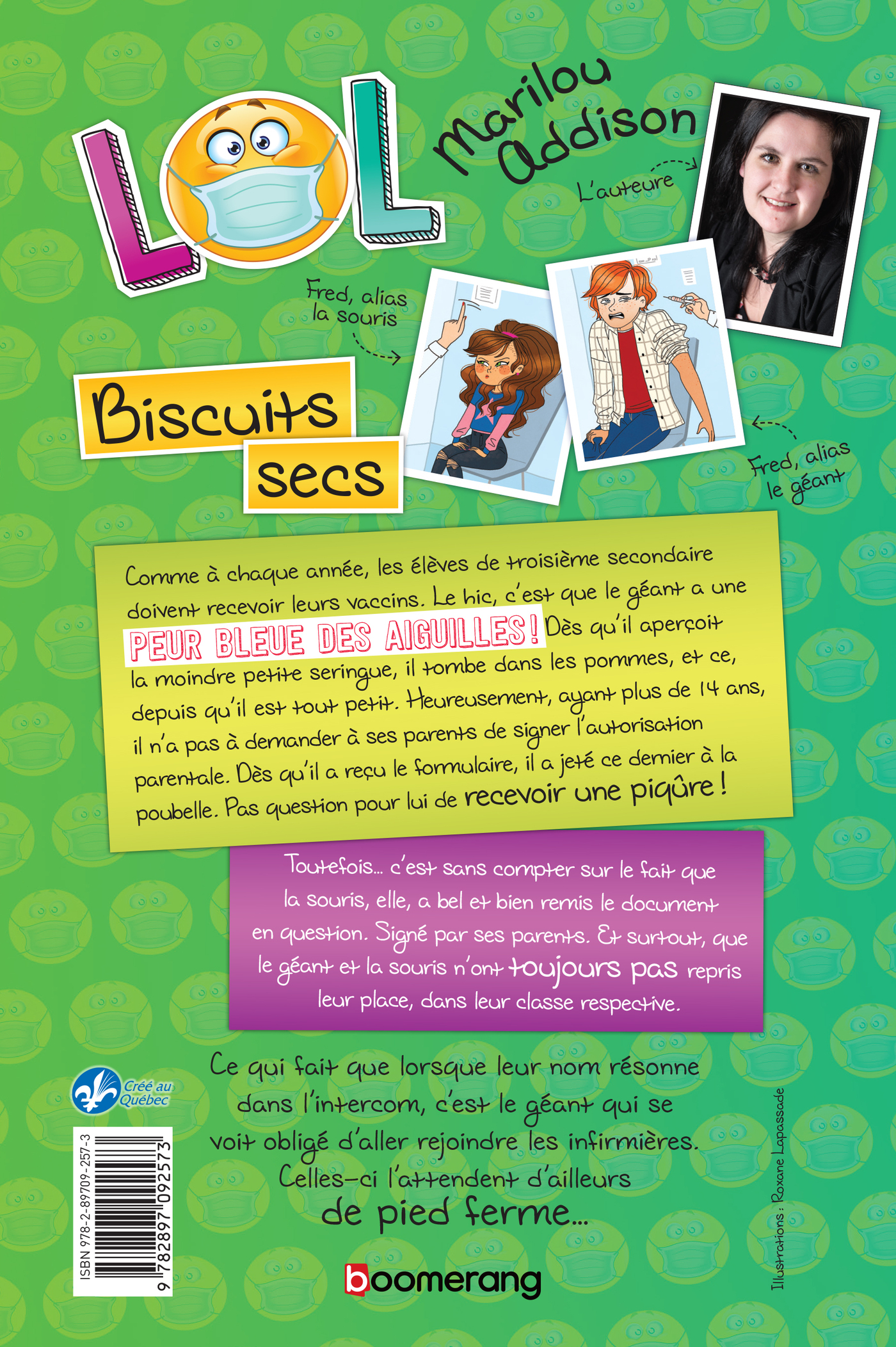 Comme à chaque année, les élèves de troisième secondaire doivent recevoir leurs vaccins. Le hic, c’est que le géant a une peur bleue des aiguilles! Dès qu’il aperçoit la moindre petite seringue, il tombe dans les pommes, et ce, depuis qu’il est tout petit. Heureusement, ayant plus de 14 ans, il n’a pas à demander à ses parents de signer l’autorisation parentale. Dès qu’il a reçu le formulaire, il a jeté ce dernier à la poubelle. Pas question pour lui de recevoir une piqûre !Toutefois… c’est sans compter sur le fait que la souris, elle, a bel et bien remis le document en question. Signé par ses parents. Et surtout, que le géant et la souris n’ont toujours pas repris leur place, dans leur classe respective.Ce qui fait que lorsque leur nom résonne dans l’intercom, c’est le géant qui se voit obligé d’aller rejoindre les infirmières.Celles-ci l’attendent d’ailleurs de pied ferme…