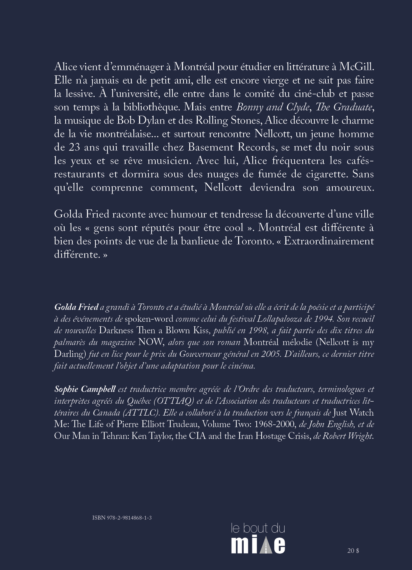 Alice vient d’emménager à Montréal pour étudier en littérature à McGill. Elle n’a jamais eu de petit ami, elle est encore vierge et ne sait pas faire la lessive. À l’université, elle entre dans le comité du ciné-club et passe son temps à la bibliothèque. Mais entre Bonny and Clyde, The Graduate, la musique de Bob Dylan et des Rolling Stones, Alice découvre le charme de la vie montréalaise... et surtout rencontre Nellcott, un jeune homme de 23 ans qui travaille chez Basement Records, se met du noir sous les yeux et se rêve musicien. Avec lui, Alice fréquentera les cafés-restaurants et dormira sous des nuages de fumée de cigarette. Sans qu’elle comprenne comment, Nellcott deviendra son amoureux.Golda Fried raconte avec humour et tendresse la découverte d’une villeoù les « gens sont réputés pour être cool ». Montréal est différente àbien des points de vue de la banlieue de Toronto. « Extraordinairement différente. »