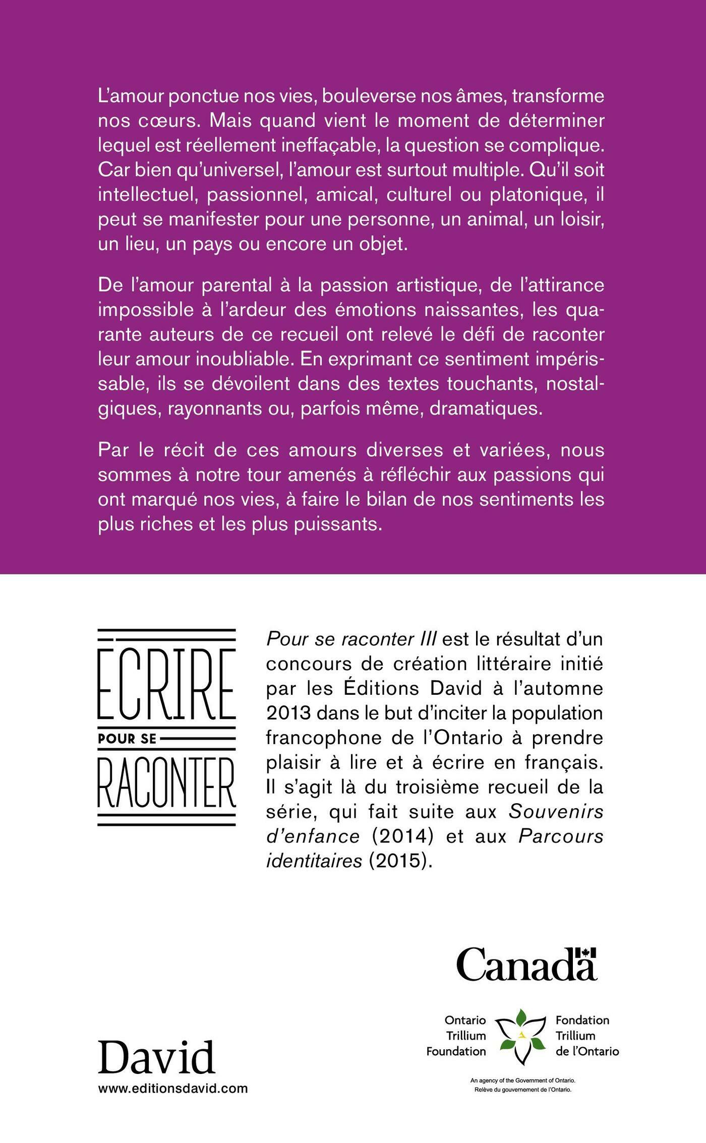 L’amour ponctue nos vies, bouleverse nos âmes, transforme nos cœurs. Mais quand vient le moment de déterminer lequel est réellement ineffaçable, la question se complique. Car bien qu’universel, l’amour est surtout multiple. Qu’il soit intellectuel, passionnel, amical, culturel ou platonique, il peut se manifester pour une personne, un animal, un loisir, un lieu, un pays ou encore un objet. De l’amour parental à la passion artistique, de l’attirance impossible à l’ardeur des émotions naissantes, les quarante auteurs de ce recueil ont relevé le défi de raconter leur amour inoubliable. En exprimant ce sentiment impérissable, ils se dévoilent dans des textes touchants, nostalgiques, rayonnants ou, parfois même, dramatiques.Par le récit de ces amours diverses et variées, nous sommes à notre tour amenés à réfléchir aux passions qui ont marqué nos vies, à faire le bilan de nos sentiments les plus riches et les plus puissants.«Pour se raconter III» est le résultat d'un concours de création littéraire initié par les Éditions David à l'automne 2013 dans le but d'inciter la population francophone de l'Ontario à prendre plaisir à lire et à écrire en français. Il s'agit là du troisième recueil de la série, qui fait suite aux «Souvenirs d'enfance» (2014) et aux «Parcours identitaires» (2015).