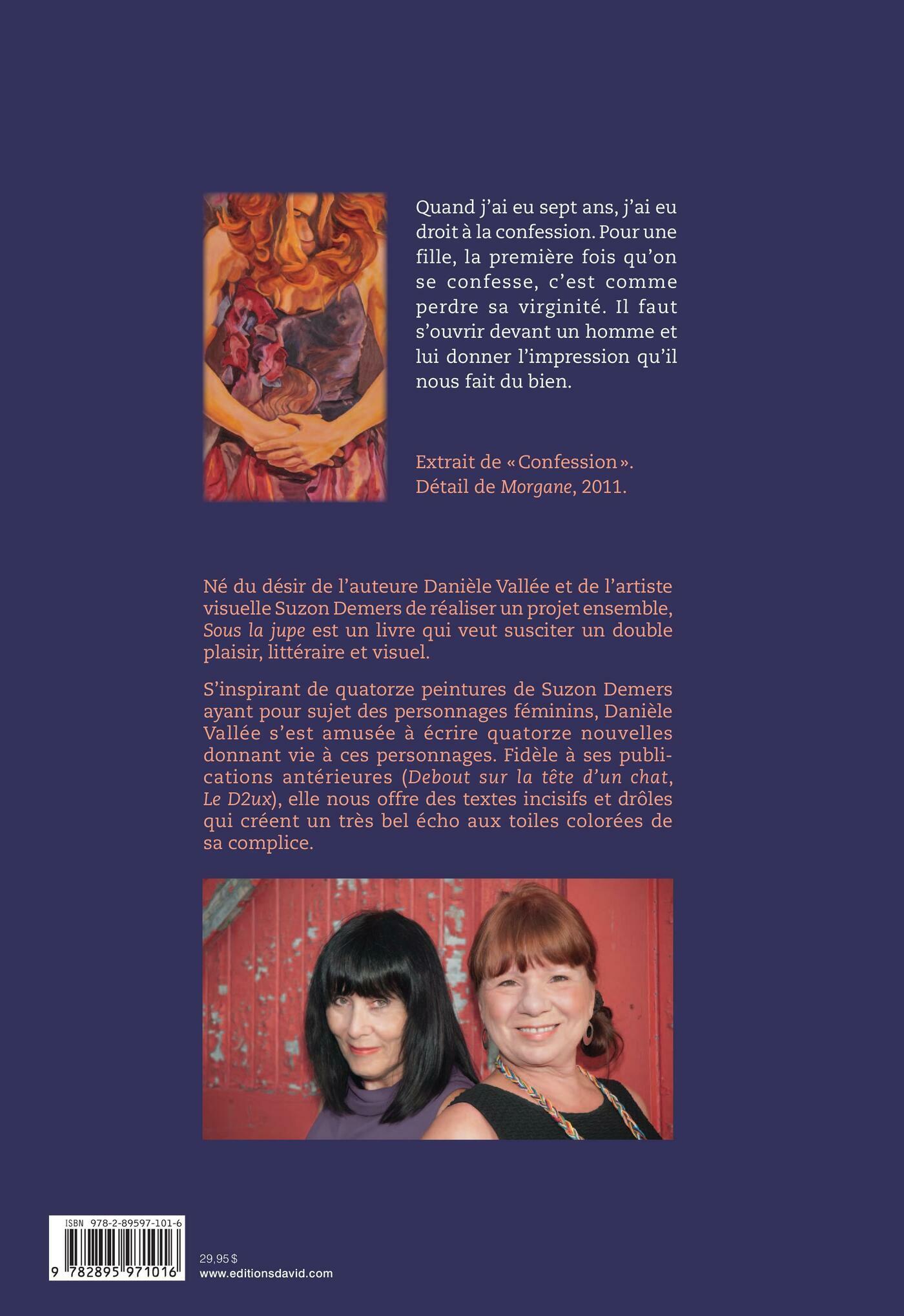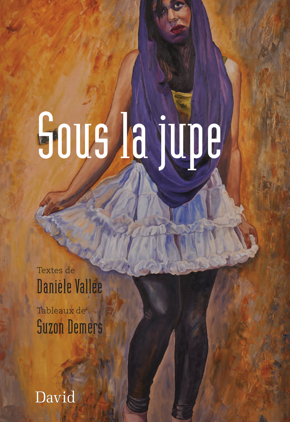 Né du désir de l’auteure Danièle Vallée et de l’artiste visuelle Suzon Demers de réaliser un projet ensemble, Sous la jupe est un livre qui veut susciter un double plaisir, littéraire et visuel. S’inspirant de quatorze peintures de Suzon Demers ayant pour sujet des personnages féminins, Danièle Vallée s’est amusée à écrire quatorze nouvelles donnant vie à ces personnages. Fidèle à ses publications antérieures (Debout sur la tête d'un chat, Le D2ux), elle nous offre des textes incisifs et drôles qui créent un très bel écho aux toiles colorées de sa complice.«Quand j’ai eu sept ans, j’ai eu droit à la confession. Pour une fille, la première fois qu’on se confesse, c’est comme perdre sa virginité. Il faut s’ouvrir devant un homme et lui donner l’impression qu’il nous fait du bien.» (Extrait de «Confession»)