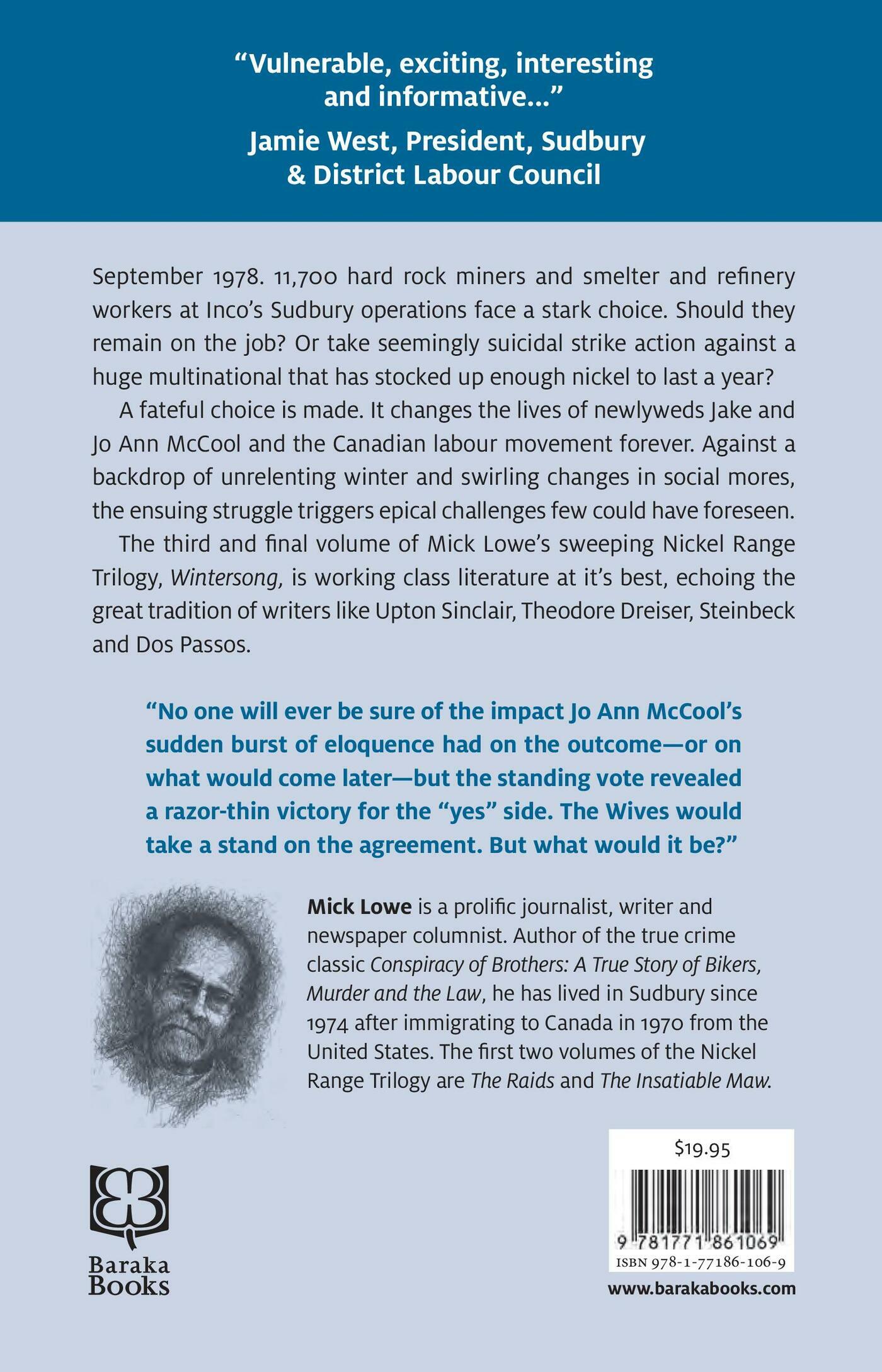 September 1978. 11,700 hard rock miners and smelter and refinery workers at Inco’s Sudbury operations face a stark choice. Should they remain on the job? Or take seemingly suicidal strike action against a huge multinational that has stocked up enough nickel to last a year?A fateful choice is made. It changes the lives of newlyweds Jake and Jo Ann McCool and the Canadian labour movement forever. Against a backdrop of unrelenting winter and swirling changes in social mores, the ensuing struggle triggers epical challenges few could have foreseen.The third and final volume of Mick Lowe’s sweeping Nickel Range Trilogy, Wintersong, is working class literature at it’s best, echoing the great tradition of writers like Upton Sinclair, Theodore Dreiser, Steinbeck and Dos Passos.