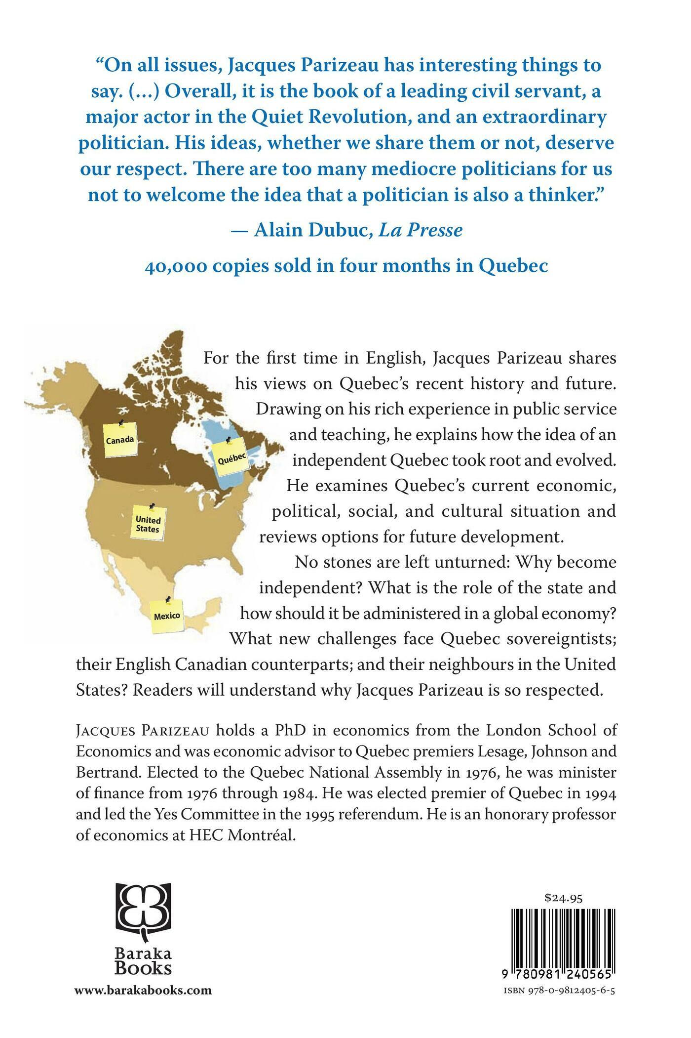 For the first time, Jacques Parizeau shares his views on Quebec's recent history and its future. As chief economics advisor to Quebec premiers in the 1960s, Jacques Parizeau was instrumental in bringing about Quebe's Quiet Revolution. As René Lévesque's Finance Minister from 1976 through 1984, he showed that sovereigntists could govern Quebec and ensure economic viability. As Premier, he brought Quebec close to sovereignty in the 1995 referendum. In 2010, he still represents an idea shared by millions in Quebec. Drawing on his rich experience in public service and teaching, Jacques Parizeau explains how the idea of an independent Quebec took root and evolved. He examines Quebec's current economic, political, social and cultural situation, and reviews options for future development. No stones are left unturned. Why become independent? What is the role of the State and how should it be administered in a globalized economy. What are the challenges in the 21st century? What about the financial crisis? And the environment? And above all what challenges face Quebec sovereigntists and their English Canadian counterparts?