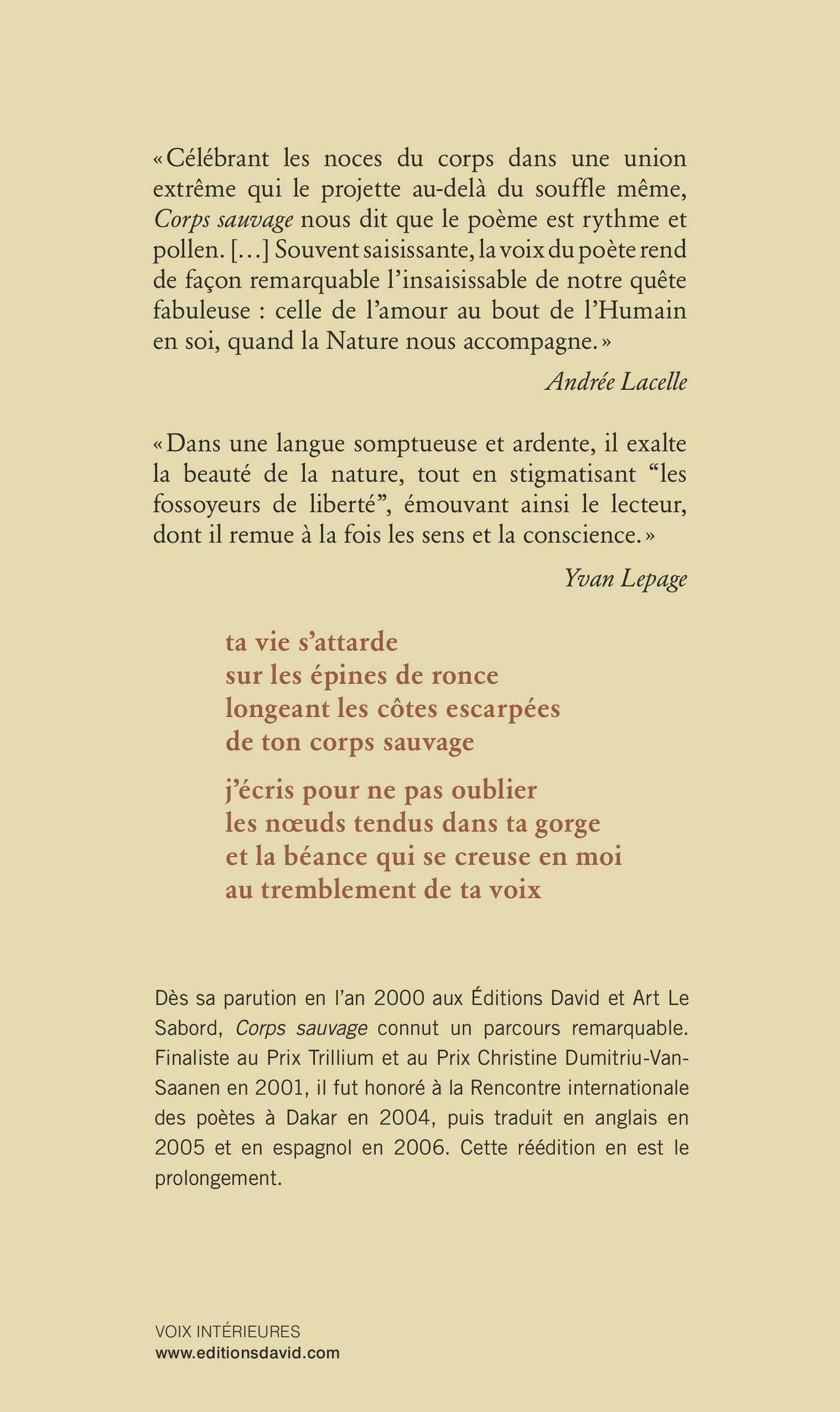 « Célébrant les noces du corps dans une union extrême qui le projette au-delà du souffle même, Corps sauvage nous dit que le poème est rythme et pollen. […] Souvent saisissante, la voix du poète rend de façon remarquable l’insaisissable de notre quête fabuleuse : celle de l’amour au bout de l’Humain en soi, quand la Nature nous accompagne. » Andrée Lacelle« Dans une langue somptueuse et ardente, il exalte la beauté de la nature, tout en stigmatisant “les fossoyeurs de liberté”, émouvant ainsi le lecteur, dont il remue à la fois les sens et la conscience. »Yvan Lepageta vie s’attarde/ sur les épines de ronce/ longeant les côtes escarpées /de ton corps sauvagej’écris pour ne pas oublier/ les nœuds tendus dans ta gorge/ et la béance qui se creuse en moi/ au tremblement de ta voixDès sa parution en l’an 2000 aux Éditions David et Art Le Sabord, Corps sauvage connut un parcours remarquable. Finaliste au Prix Trillium et au Prix Christine Dumitriu-Van-Saanen en 2001, il fut honoré à la Rencontre internationale des poètes à Dakar en 2004, puis traduit en anglais en 2005 et en espagnol en 2006. Cette réédition en est le prolongement.