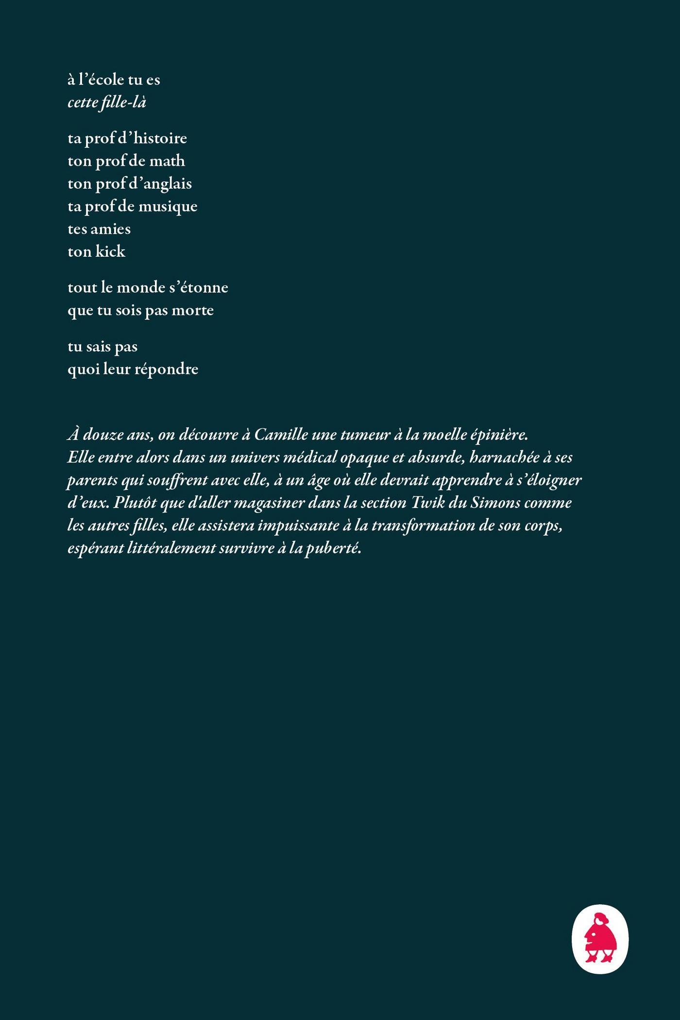 à l’école tu escette fille-làta prof d’histoireton prof de mathton prof d’anglaista prof de musiquetes amieston kicktout le monde s’étonneque tu sois pas mortetu sais pasquoi leur répondreÀ douze ans, on découvre à Camille une tumeur à la moelle épinière. Elle entre alors dans un univers médical opaque et absurde, harnachée à ses parents qui souffrent avec elle, à un âge où elle devrait apprendre à s’éloigner d’eux. Plutôt que d'aller magasiner dans la section Twik du Simons comme les autres filles, elle assistera impuissante à la transformation de son corps, espérant littéralement survivre à la puberté.