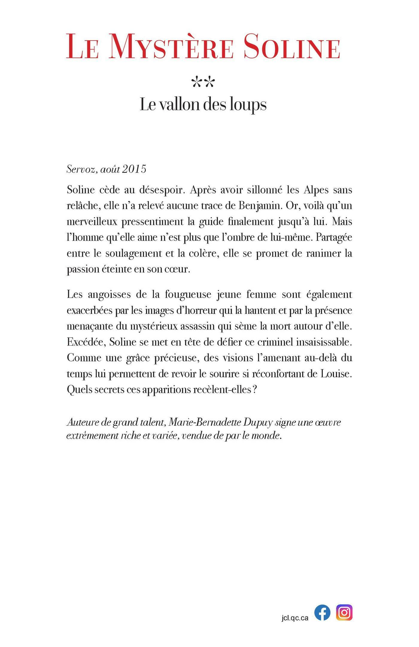 Servoz, août 2015Soline est désespérée. Après avoir sillonné les Alpes sans relâche, elle n’a relevé aucune trace de Benjamin. Or, voilà bientôt qu’un merveilleux pressentiment la guide jusqu’à lui. Mais l’homme qu’elle aime ne semble plus que l’ombre de lui-même. Partagée entre le soulagement et la colère, elle se promet de ranimer la passion éteinte en son coeur. Les angoisses de la fougueuse jeune femme sont en outre exacerbées par les images d’horreur qui la hantent et par la présence menaçante du mystérieux assassin qui sème lamort autour d’elle. Excédée, Soline se met en tête de défier ce criminel insaisissable. Comme une grâce précieuse, des visionsl’amenant au-delà du temps, cent ans plus tôt, lui permettent de revoir le sourire si réconfortant de Louise. Quels secrets ces apparitions recèlent-elles ?