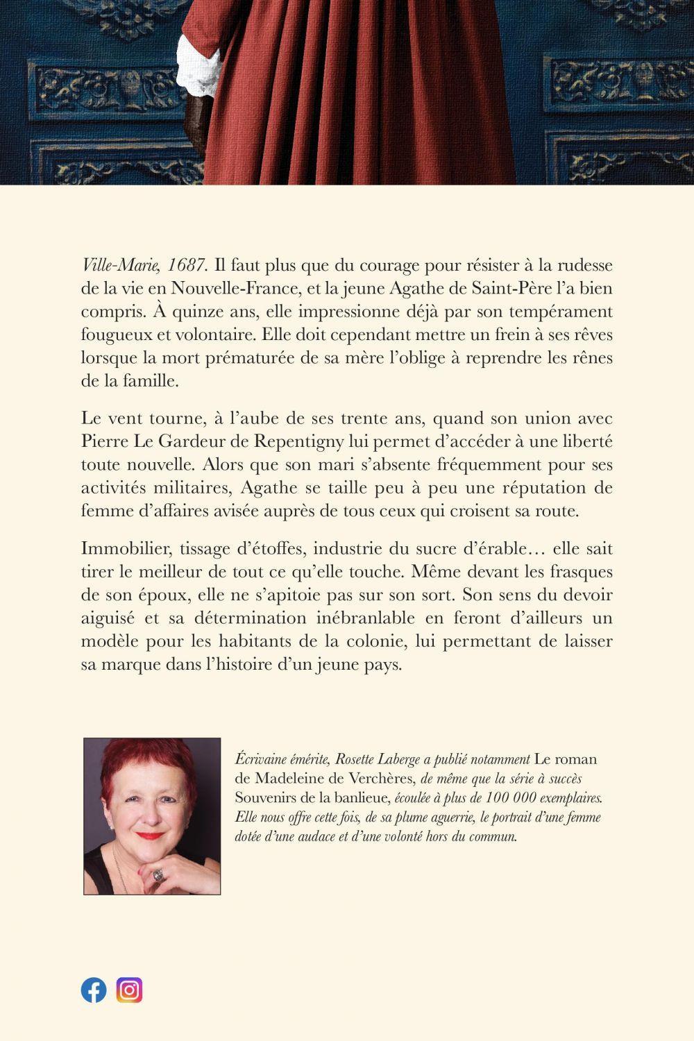 Ville-Marie, 1687. Il faut plus que du courage pour résister à la rudesse de la vie en Nouvelle-France, et la jeune Agathe de Saint-Père l’a bien compris. À quinze ans, elle impressionne déjà par son tempérament fougueux et volontaire. Elle doit cependant mettre un frein à ses rêves lorsque la mort prématurée de sa mère l’oblige à reprendre les rênes de la famille.Le vent tourne, à l’aube de ses trente ans, quand son union avec Pierre Le Gardeur de Repentigny lui permet d’accéder à une liberté toute nouvelle. Alors que son mari s’absente fréquemment pour ses activités militaires, Agathe se taille peu à peu une réputation de femme d’affaires avisée auprès de tous ceux qui croisent sa route.Immobilier, tissage d’étoffes, industrie du sucre d’érable… elle sait tirer le meilleur de tout ce qu’elle touche. Même devant les frasques de son époux, elle ne s’apitoie pas sur son sort. Son sens du devoir aiguisé et sa détermination inébranlable en feront d’ailleurs un modèle pour les habitants de la colonie, lui permettant de laisser sa marque dans l’histoire d’un jeune pays. Écrivaine émérite, Rosette Laberge a publié notamment Le roman de Madeleine de Verchères, de même que la série à succès Souvenirs de la banlieue,, écoulée à plus de 100 000 exemplaires. Elle nous offre cette fois, de sa plume aguerrie, le portrait d’une femme dotée d’une audace et d’une volonté hors du commun.