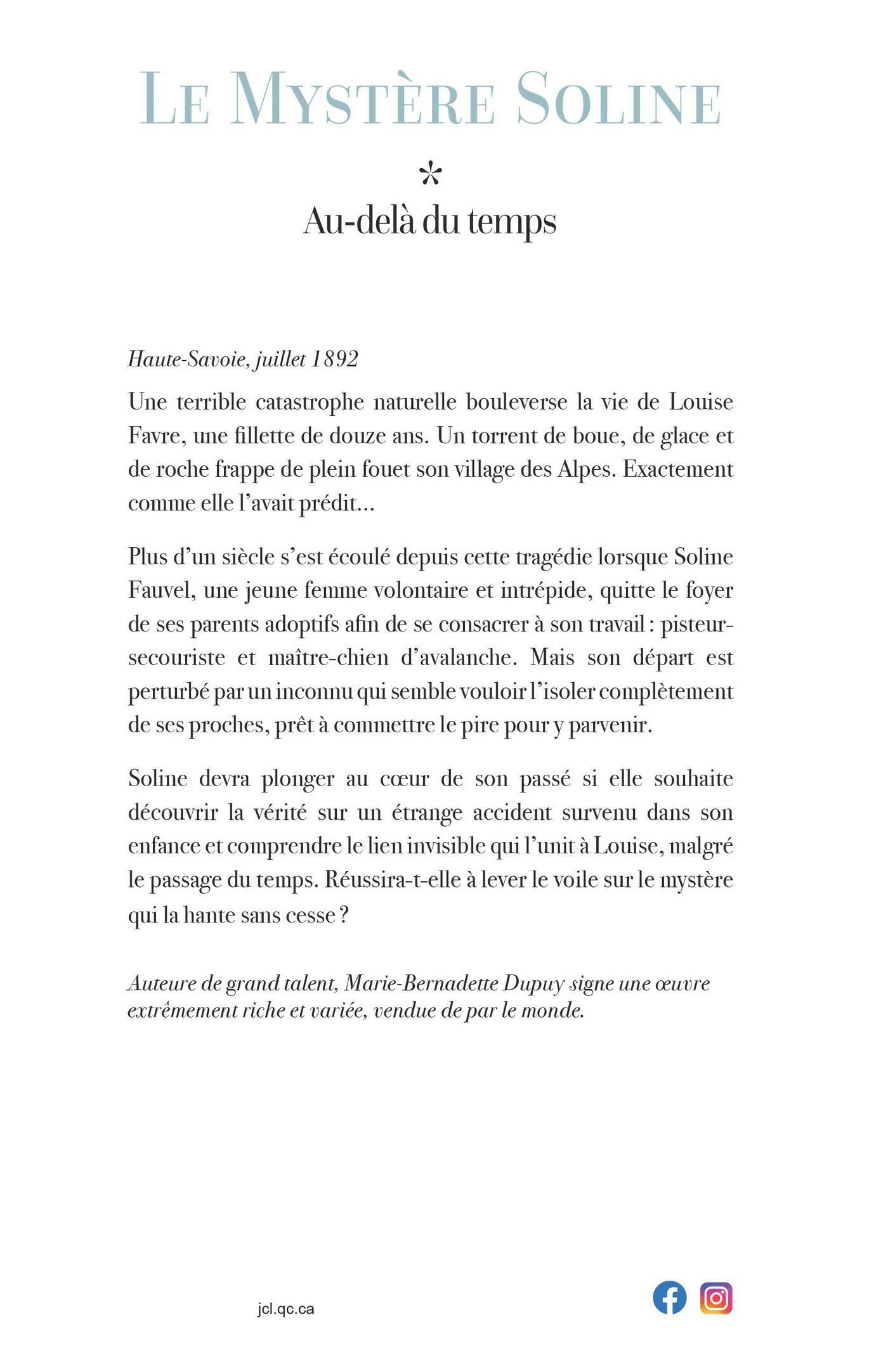 Haute-Savoie, juillet 1892.Une terrible catastrophe naturelle bouleverse la vie de Louise Favre, une fillette de douze ans. Un torrent de boue, de glace et de roche frappe de plein fouet son village des Alpes. Exactementcomme elle l'avait prédit... Plus d’un siècle s’est écoulé depuis cette tragédie lorsque Soline Fauvel, une jeune femme volontaire et intrépide, quitte lefoyer de ses parents adoptifs afin de se consacrer à son travail : pisteuse-secouriste et maître-chien d'avalanche. Mais son départ est perturbé par un inconnu qui semble vouloir l’isoler complètement de ses proches, prêt à commettre le pire poury parvenir. Soline devra plonger au coeur de son passé si elle souhaite découvrir la vérité sur l’étrange accident survenu dans sonenfance et comprendre le lien invisible qui l’unit à Louise, malgré les décennies qui les séparent. Réussira-t-elle à lever le voile surle mystère qui la hante sans cesse ?