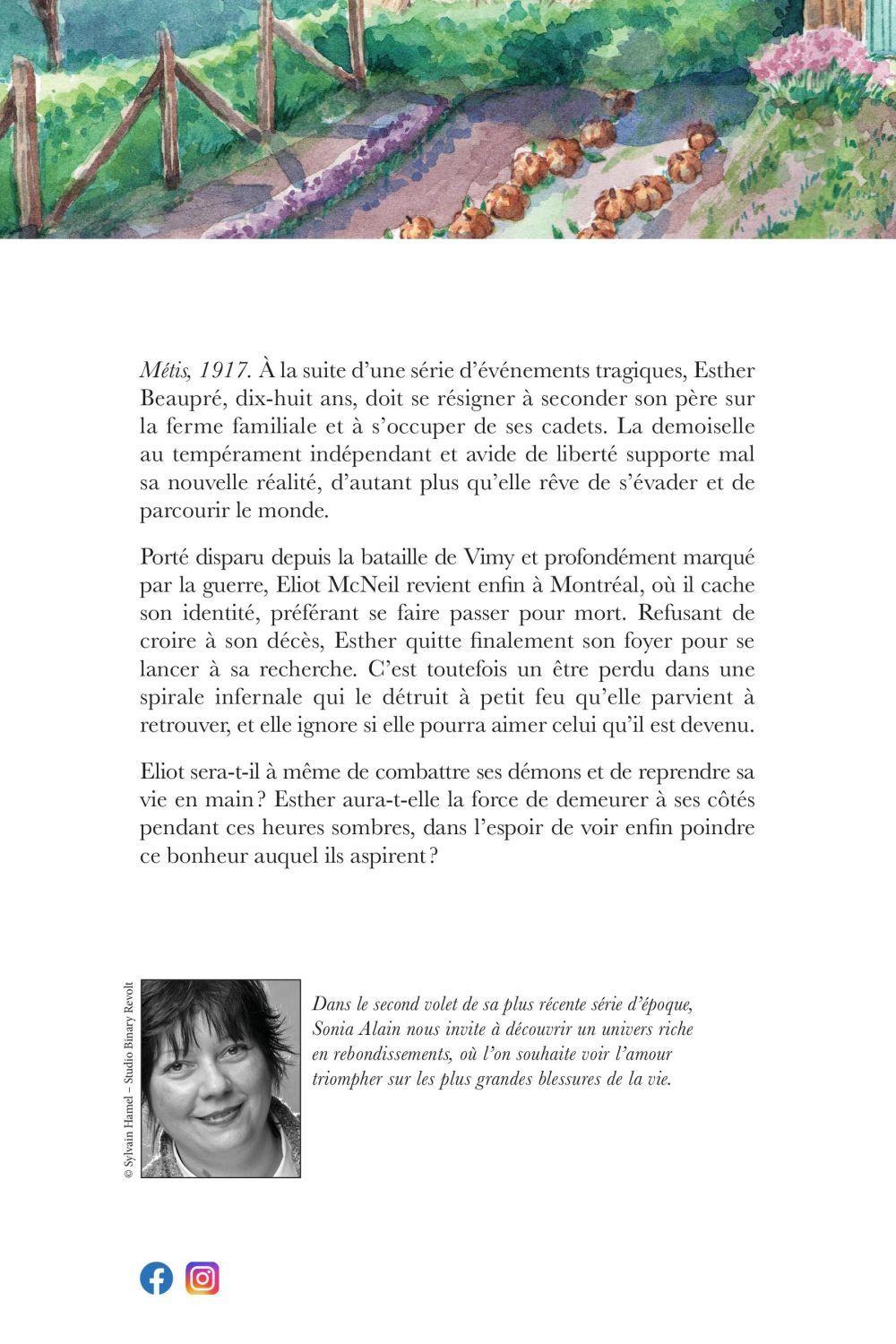 Métis, 1917. À la suite d’une série d’événements tragiques, Esther Beaupré, dix-huit ans, doit se résigner à seconder son père sur la ferme familiale et à s’occuper de ses cadets. La demoiselle au tempérament indépendant et avide de liberté supporte mal sa nouvelle réalité, d’autant plus qu’elle rêve de s’évader et de parcourir le monde.Porté disparu depuis la bataille de Vimy et profondément marqué par la guerre, Eliot McNeil revient enfin à Montréal, où il cache son identité, préférant se faire passer pour mort. Refusant de croire à son décès, Esther quitte finalement son foyer pour se lancer à sa recherche. C’est toutefois un être perdu dans une spirale infernale qui le détruit à petit feu qu’elle parvient à retrouver, et elle ignore si elle pourra aimer celui qu’il est devenu.Eliot sera-t-il à même de combattre ses démons et de reprendre sa vie en main ? Esther aura-t-elle la force de demeurer à ses côtés pendant ces heures sombres, dans l’espoir de voir enfin poindre ce bonheur auquel ils aspirent ?Dans le second volet de sa plus récente série d’époque, Sonia Alain nous invite à découvrir un univers riche en rebondissements, où l’on souhaite voir l’amour triompher sur les plus grandes blessures de la vie.