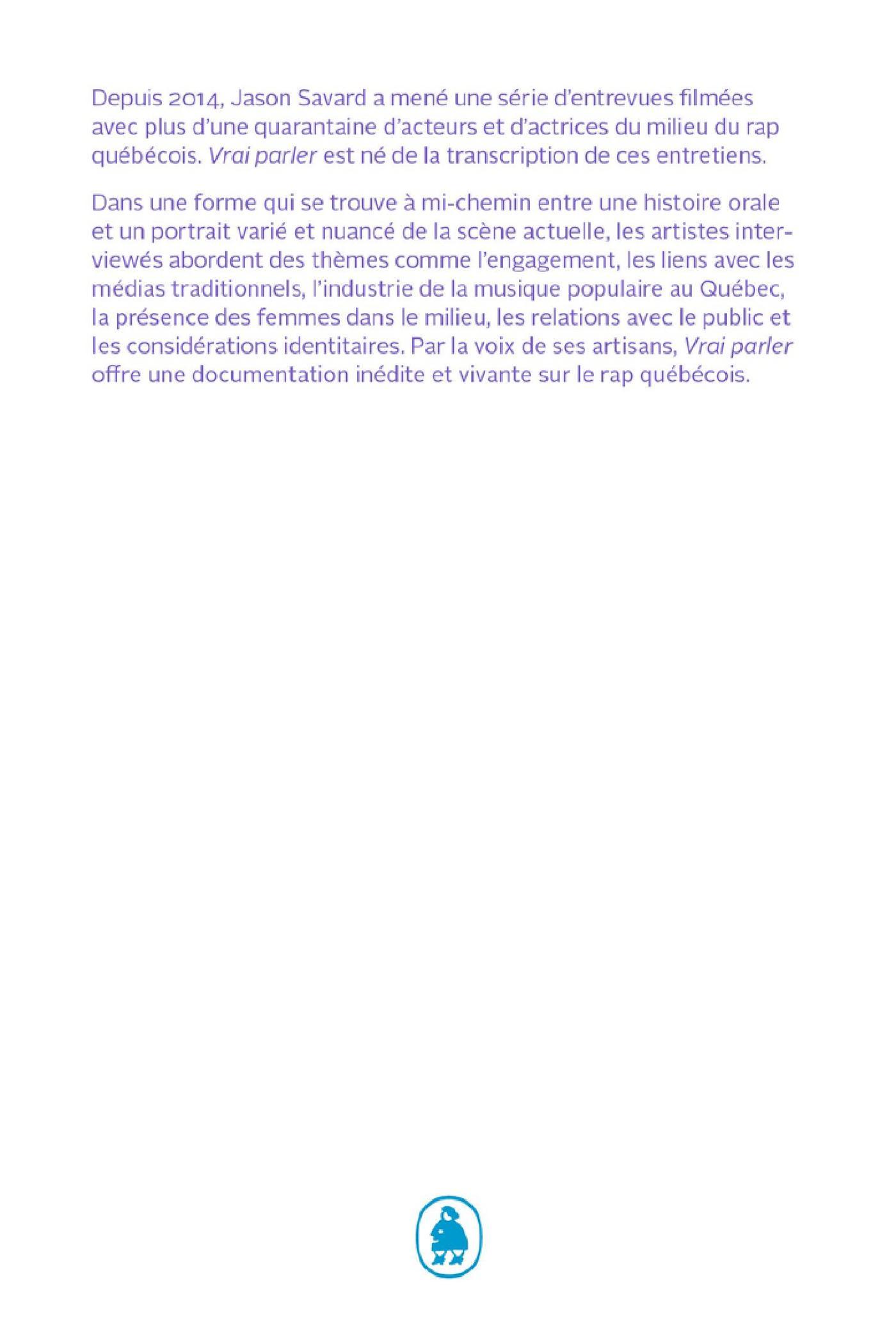 Vrai parler présente l'univers du rap québécois à travers les propos croisés de plus d'une quarantaine de ses acteurs. Dans une forme qui se trouve à mi-chemin entre une histoire orale et un portrait varié et nuancé de la scène actuelle, les artistes abordent des thèmes comme l'engagement, la présence des femmes, les liens avec les médias traditionnels et l'industrie de la musique populaire au Québec, les relations avec le public et les considérations identitaires. Vrai parler offre une documentation inédite du rap québécois et présente cette pratique artistique par la voix de ses artisans.