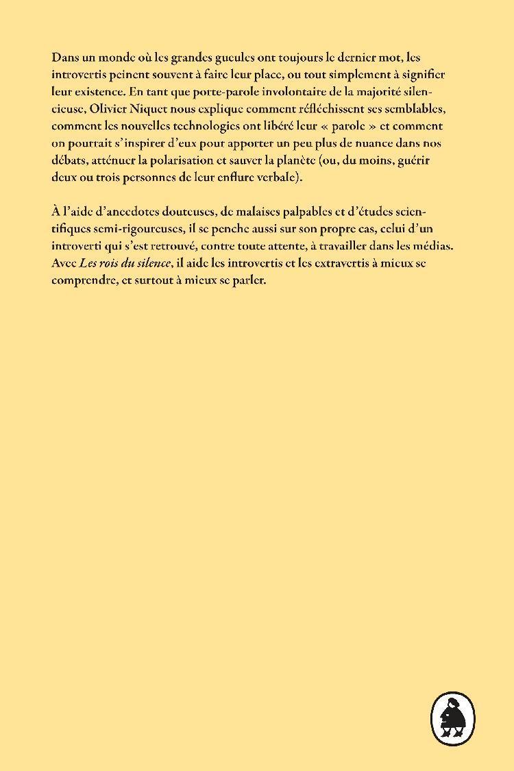 Dans un monde où les grandes gueules ont toujours le dernier mot, les introvertis peinent souvent à faire leur place, ou tout simplement à signifier leur existence. En tant que porte-parole involontaire de la majorité silencieuse, Olivier Niquet nous explique comment réfléchissent ses semblables, comment les nouvelles technologies ont libéré leur « parole » et comment on pourrait s’inspirer d’eux pour apporter un peu plus de nuance dans nos débats, atténuer la polarisation et sauver la planète (ou, du moins, guérir deux ou trois personnes de leur enflure verbale). À l’aide d’anecdotes douteuses, de malaises palpables et d’études scientifiques semi-rigoureuses, il se penche aussi sur son propre cas, celui d’un introverti qui s’est retrouvé, contre toute attente, à travailler dans les médias. Avec Les rois du silence, il aide les introvertis et les extravertis à mieux se comprendre, et surtout à mieux se parler.