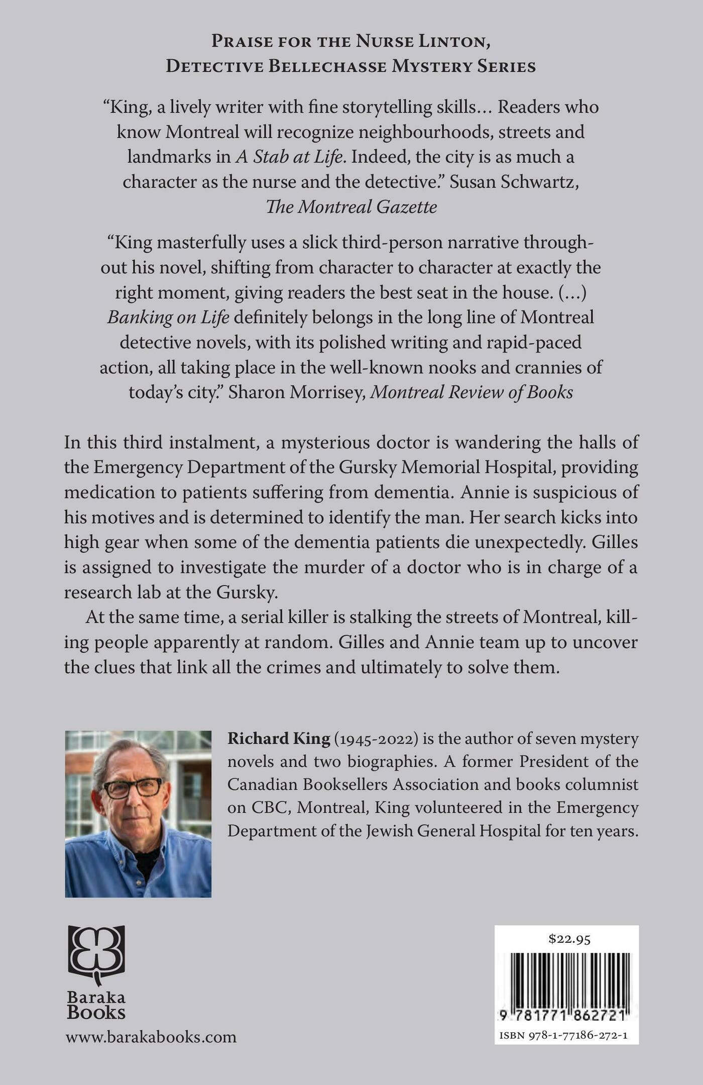 In Serving Life, a mysterious doctor is wandering the halls of the Emergency Department of the Gursky Memorial Hospital, providing medication to patients suffering from dementia. Annie is suspicious of his motives and is determined to identify the man. Her search kicks into high gear when some of the dementia patients die unexpectedly. Gilles is assigned to investigate the murder of a doctor who is in charge of a research lab at the Gursky.At the same time, a serial killer is stalking the streets of Montreal, killing people apparently at random. Gilles and Annie team up to uncover the clues that link all the crimes and ultimately to solve them.Richard King is the author of seven mystery novels and two biographies. A former President of the Canadian Booksellers Association and books columnist on CBC, Montreal, King volunteered in the Emergency Department of the Jewish General Hospital for ten years. Serving Life follows on A Stab at Life and Banking on Life.Praise for the Nurse Linton, Detective Bellechasse Mystery Series“King, a lively writer with fine storytelling skills… Readers who know Montreal will recognize neighbourhoods, streets and landmarks in A Stab at Life. Indeed, the city is as much a character as the nurse and the detective.” Susan Schwartz, The Montreal Gazette“King masterfully uses a slick third-person narrative throughout his novel, shifting from character to character at exactly the right moment, giving readers the best seat in the house. (…) Banking on Life definitely belongs in the long line of Montreal detective novels, with its polished writing and rapid-paced action, all taking place in the well-known nooks and crannies of today’s city.” Sharon Morrisey, Montreal Review of Books