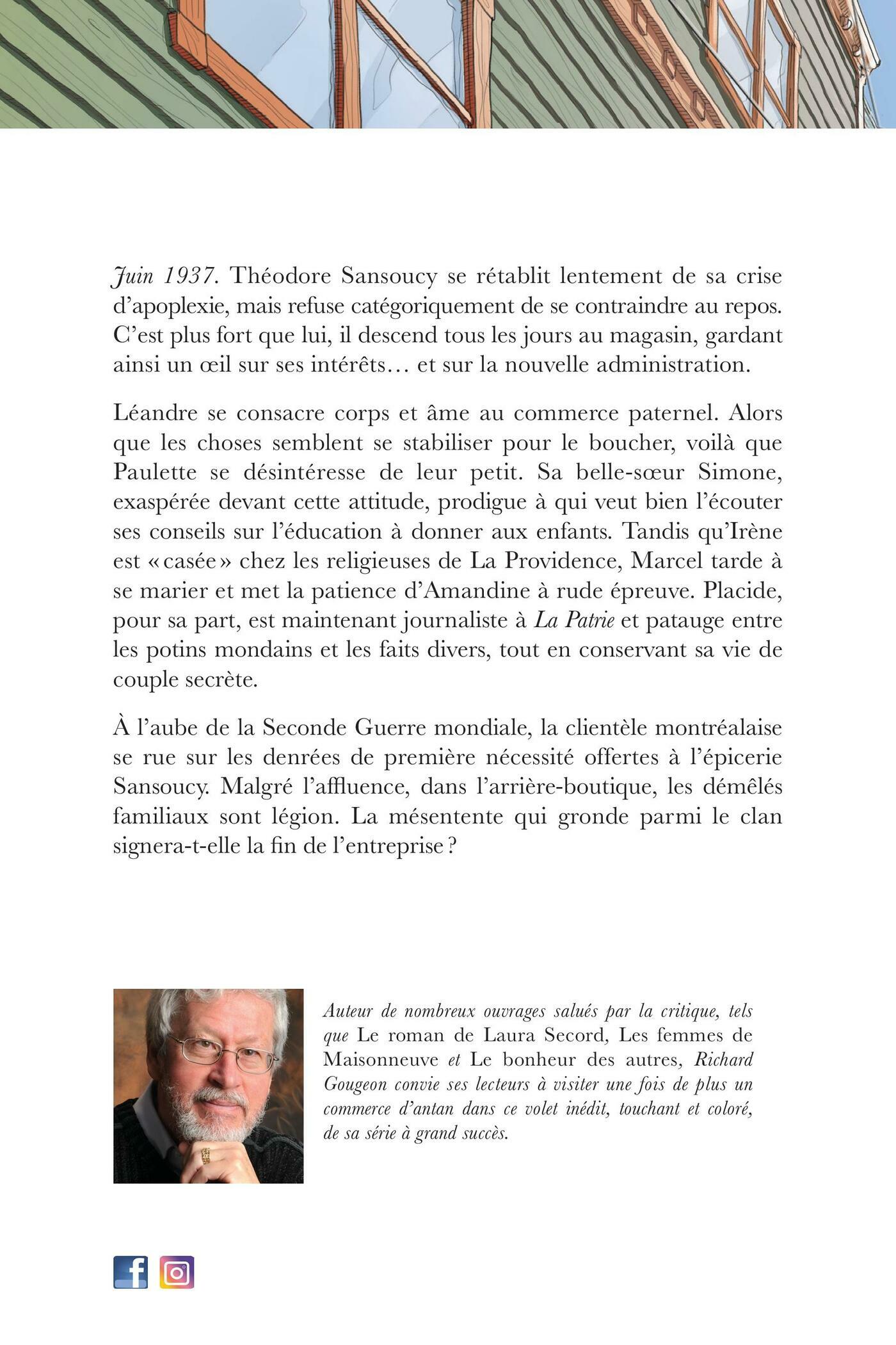 Juin 1937. Théodore Sansoucy se rétablit lentement de sa crise d’apoplexie, mais refuse catégoriquement de se contraindre au repos. C’est plus fort que lui, il descend tous les jours au magasin, gardant ainsi un œil sur ses intérêts… et sur la nouvelle administration.Léandre se consacre corps et âme au commerce paternel. Alors que les choses semblent se stabiliser pour le boucher, voilà que Paulette se désintéresse de leur petit. Sa belle-soeur Simone, exaspérée devant cette attitude, prodigue à qui veut bien l’écouter ses conseils sur l’éducation à donner aux enfants. Tandis qu’Irène est « casée » chez les religieuses de La Providence, Marcel tarde à se marier et met la patience d’Amandine à rude épreuve. Placide, pour sa part, est maintenant journaliste à La Patrie et patauge entre les potins mondains et les faits divers, tout en conservant sa vie de couple secrète.À l’aube de la Seconde Guerre mondiale, la clientèle montréalaise se rue sur les denrées de première nécessité offertes à l’épicerie Sansoucy. Malgré l’affluence, dans l’arrière-boutique, les démêlés familiaux sont légion. La mésentente qui gronde parmi le clan signera-t-elle la fin de l’entreprise ?Auteur de nombreux ouvrages salués par la critique, tels que Le roman de Laura Secord, Les femmes de Maisonneuve et Le bonheur des autres, Richard Gougeon convie ses lecteurs à visiter une fois de plus un commerce d’antan dans ce volet inédit, touchant et coloré, de sa série à grand succès.