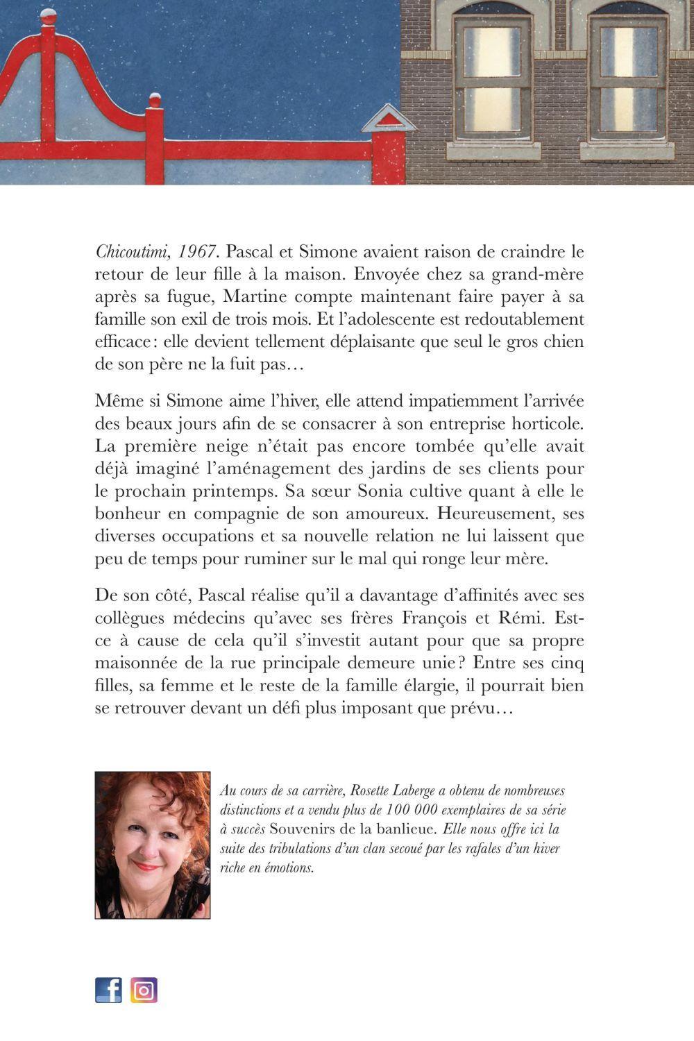 Chicoutimi, 1967. Pascal et Simone avaient raison de craindre le retour de leur fille à la maison. Envoyée chez sa grand-mère après sa fugue, Martine compte maintenant faire payer à sa famille son exil de trois mois. Et l’adolescente est redoutablement efficace : elle devient tellement déplaisante que seul le gros chien de son père ne la fuit pas…Même si Simone aime l’hiver, elle attend impatiemment l’arrivée des beaux jours afin de se consacrer à son entreprise horticole. La première neige n’était pas encore tombée qu’elle avait déjà imaginé l’aménagement des jardins de ses clients pour le prochain printemps. Sa sœur Sonia cultive quant à elle le bonheur en compagnie de son amoureux. Heureusement, ses diverses occupations et sa nouvelle relation ne lui laissent que peu de temps pour ruminer sur le mal qui ronge leur mère.De son côté, Pascal réalise qu’il a davantage d’affinités avec ses collègues médecins qu’avec ses frères François et Rémi. Est-ce à cause de cela qu’il s’investit autant pour que sa propre maisonnée de la rue principale demeure unie ? Entre ses cinq filles, sa femme et le reste de la famille élargie, il pourrait bien se retrouver devant un défi plus imposant que prévu…Au cours de sa carrière, Rosette Laberge a obtenu de nombreuses distinctions et a vendu plus de 100 000 exemplaires de sa série à succès Souvenirs de la banlieue. Elle nous offre ici la suite des tribulations d’un clan secoué par les rafales d’un hiver riche en émotions.