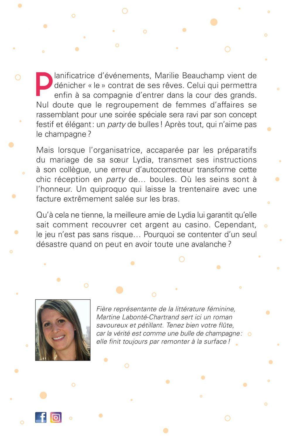 Planificatrice d’événements, Marilie Beauchamp vient de dénicher « le » contrat de ses rêves. Celui qui permettra enfin à sa compagnie d’entrer dans la cour des grands. Nul doute que le regroupement de femmes d’affaires se rassemblant pour une soirée spéciale sera ravi par son concept festif et élégant : un party de bulles ! Après tout, qui n’aime pas le champagne ?Mais lorsque l’organisatrice, accaparée par les préparatifs du mariage de sa soeur Lydia, transmet ses instructions à son collègue, une erreur d’autocorrecteur transforme cette chic réception en party de… boules. Où les seins sont à l’honneur. Un quiproquo qui laisse la trentenaire avec une facture extrêmement salée sur les bras.Qu’à cela ne tienne, la meilleure amie de Lydia lui garantit qu’elle sait comment recouvrer cet argent au casino. Cependant, le jeu n’est pas sans risque… Pourquoi se contenter d’un seul désastre quand on peut en avoir toute une avalanche ? Fière représentante de la littérature féminine, Martine Labonté-Chartrand sert ici un roman savoureux et pétillant. Tenez bien votre flûte, car la vérité est comme une bulle de champagne : elle finit toujours par remonter à la surface !