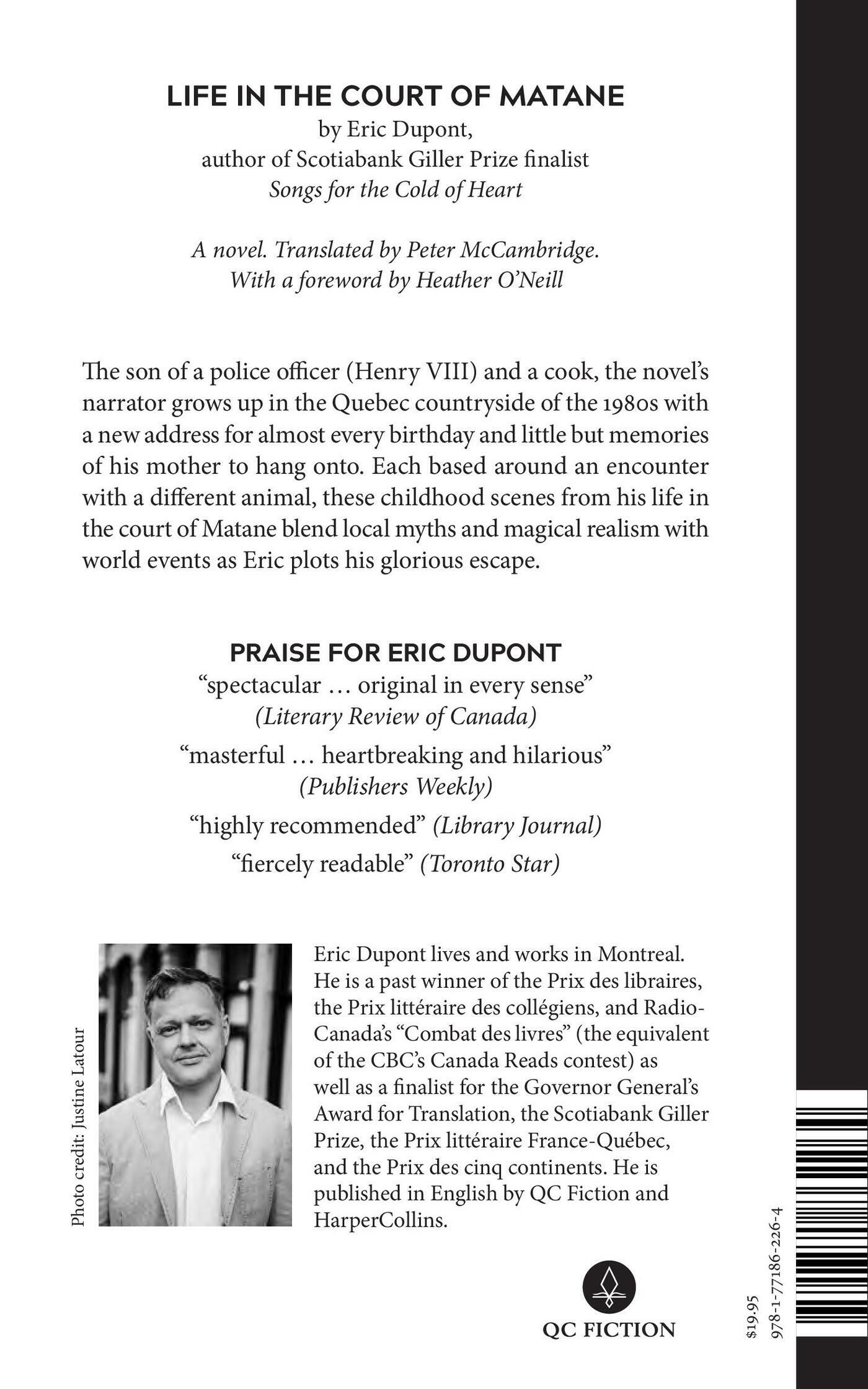 Nadia Comaneci’s gold-medal performance at the Olympic Games in Montreal is the starting point for a whole new generation. Eric Dupont watches the performance on TV, mesmerized. The son of a police officer (Henry VIII) and a professional cook—as he likes to remind us—he grows up in the depths of the Quebec countryside with a new address for almost every birthday and little but memories of his mother to hang onto. His parents have divorced, and the novel’s narrator relates his childhood, comparing it to a family gymnastics performance worthy of Nadia herself.Life in the court of Matane is unforgiving, and we explore different facets of it (dreams of sovereignty, schoolyard bullying, imagined missions to Russia, poems by Baudelaire), each based around an encounter with a different animal, until the narrator befriends a great horned owl, summons up the courage to let go of the upper bar forever, and makes his glorious escape.PRAISE FOR LIFE IN THE COURT OF MATANE“This novel from Dupont … the first from a new fiction imprint dedicated to publishing ‘the very best of a new generation of Quebec storytellers in flawless English translation,’ lives up to that ambition. … By turns poignant, playful, and nostalgic, the book evokes ’70s Quebec with the quirky but successful device of combining an autobiographical family story with motifs drawn from fable, history, politics and myth. … Translator McCambridge beautifully captures the joyous top notes and the darker undercurrents of this fascinating voice.” (Publishers Weekly) “Dupont is a writer of such intelligence and skill that he is able to not only become a philosopher, but a poet, who not only understands the horrors of a dysfunctional childhood, but also knows what is beautiful about it. And this book is a testament to his unwavering generosity towards both his characters and the people of Quebec.” (Heather O’Neill, author)“Wildly imaginative … a remarkably sensitive and intelligent coming-of-age story told with an irresistible blend of heartache, humour and magic.” (Numéro Cinq)“A beautiful, tragicomic coming-of-age story … This translation is knocking my socks off.” (Bronwyn Averett, Book Riot)“With an excellent translation by McCambridge, one which reads smoothly and keeps the humour which undoubtedly pervades the original, Dupont’s novel makes for an entertaining look at a Québécois childhood. … It all makes for an impressive start for QC Fiction.” (Tony’s Reading List)“a captivating voice that sharply trapezes between a heightened version of his parents’ divorce and life in the countryside … Eric’s insights brim with intelligence.” (Foreword Reviews)“Tangential, expansive in its ability to capture youth at a crossroads, and unexpectedly piercing … an inventive novel” (Foreword Reviews)“QC Fiction has done a great service to English readers everywhere by translating this popular Quebec novel for us.” (The Miramichi Reader)“an irreverent cocktail … a feast of a novel, calorie-filled and decadent” (Québec Reads)“At the time, it seemed all of Quebec was trying to stay aloft between many sets of uneven bars. There was the feud between the sovereigntists and the federalists keeping society off-balance … The conservative traditionalism of the Duplessis era was disappearing in favour of the more progressive values of the Quiet Revolution. Religious faith was dissipating in Quebec homes, yet children were still being taught by nuns in Catholic schools. Comaneci’s gymnastics set the scene for an exploration of all these faultlines in Dupont’s autobiographical novel, Life in the Court of Matane. … For the informed, and for those prepared to laugh at Quebec’s peccadilloes, this is a hilarious romp.” (Quill & Quire)“a classic coming-of-age novel worth pondering over” (Steven Buechler, The Library of Pacific Tranquility)“a highly original read” (PRISM magazine)“Dupont’s gift is that his stories have never been told in such a way before, could only ever be told in that way, and will never again be told like that.” (Buried in Print)Eric Dupont was born in Amqui, Quebec, in 1970. He left his native Gaspé Peninsula at age 16 for Austria and other faraway locales, returning to Quebec in 2003 to accept a position as a lecturer in translation at the McGill University School of Continuing Studies. His fourth novel, La Fiancée américaine, released in 2012, won the Prix des libraires du Québec and the Prix littéraire des collégiens. Its English translation by Peter McCambridge, Songs for the Cold of Heart, was a finalist for the Scotiabank Giller Prize in 2018 and subsequently published by HarperVia, outside of Canada, under the title The American Fiancée. One of the hallmarks of Eric’s writing is the juxtaposition of the supernatural and real worlds. The lighthearted tone of his work often belies undercurrents of deeper themes and meanings.Originally from Ireland, Peter McCambridge holds a BA in modern languages from Cambridge University, England, and has lived in Quebec City since 2003. He runs Québec Reads and now QC Fiction. Life in the Court of Matane was the first novel he chose for this collection and the book that made him want to become a literary translator in the first place. His translation of the first chapter won the 2012 John Dryden Translation Prize. His translations have been World Literature Today Notable Translations, longlisted for Canada Reads, and finalists for the Giller Prize and the Governor General’s Award for Translation.