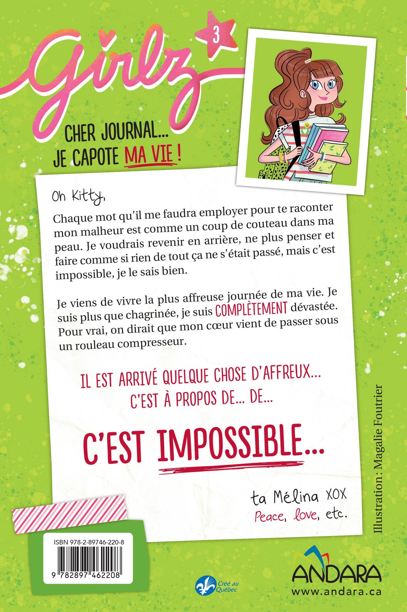 Oh Kitty,Chaque mot qu’il me faudra employer pour te raconter mon malheur est comme un coup de couteau dans ma peau. Je voudrais revenir en arrière, ne plus penser et faire comme si rien de tout ça ne s’était passé, mais c’est impossible, je le sais bien.Je viens de vivre la plus affreuse journée de ma vie. Je suis plus que chagrinée, je suis COMPLÈTEMENT dévastée. Pour vrai, on dirait que mon cœur vient de passer sous un rouleau compresseur.IL EST ARRIVÉ QUELQUE CHOSE D’AFFREUX…C’EST À PROPOS DE… DE…C’EST IMPOSSIBLE…ta Mélina XOXPeace, love, etc.