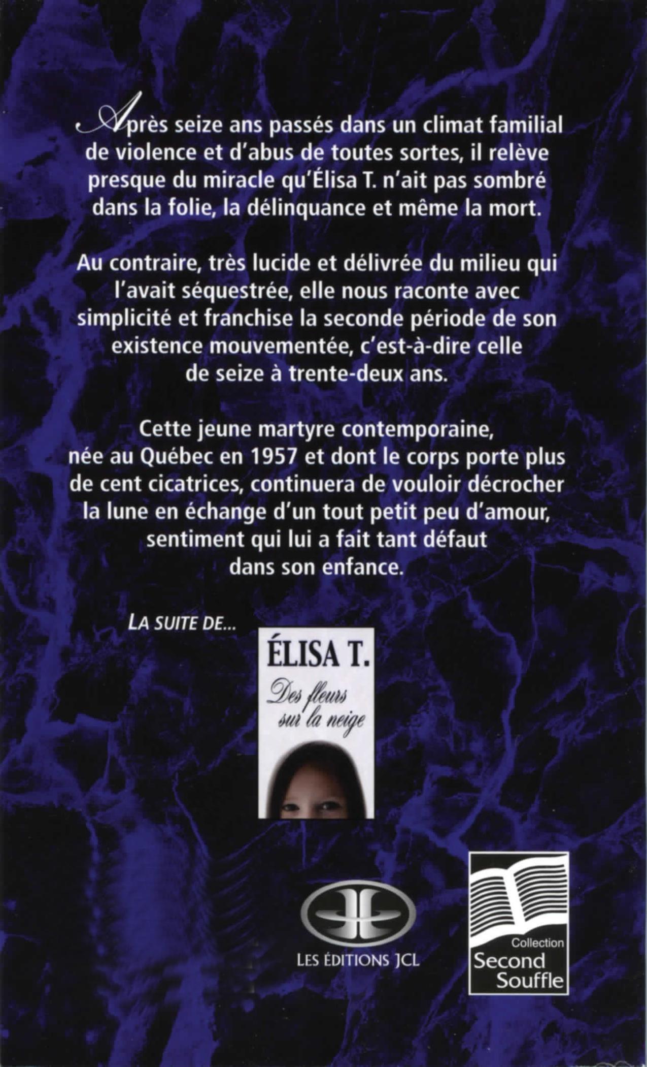 Il aura fallu cinq ans avant qu'Élisa T. ne se décide à nous servir le reste de sa vie. Violentée et abusée physiquement par sa mère et le concubin de cette dernière pendant seize ans, cette seconde enfant, d'une famille de dix, sera retirée in extremis de sa famille grâce à l'intervention efficace de son directeur d'école.Après une difficile période d'adaptation dans des foyers d'accueil, la courageuse adolescente découvrira peu à peu le monde extérieur. Élisa quittera tôt l'école pour se trouver un premier travail dans un restaurant. Toutefois, elle n'oublie pas son passé, et aidera quelques frères et sœurs, restés dans ce qu'elle appelle «l'enfer», à quitter cette maison «maudite».Elle trouvera son «prince charmant», elle enfantera d'une première fille dans l'ignorance et la solitude et, enfin, se mariera pour prouver à sa mère qu'elle avait tort de lui prédire qu'aucun homme ne voudrait jamais d'elle.Afin de se vider le cœur une fois pour toutes, elle se met tranquillement à la rédaction de son journal intime qui raconte avec force détails ses seize années d'enfant abusée. Élisa, par ses deux écrits sincères, demeure un exemple vivant de courage pour tous.