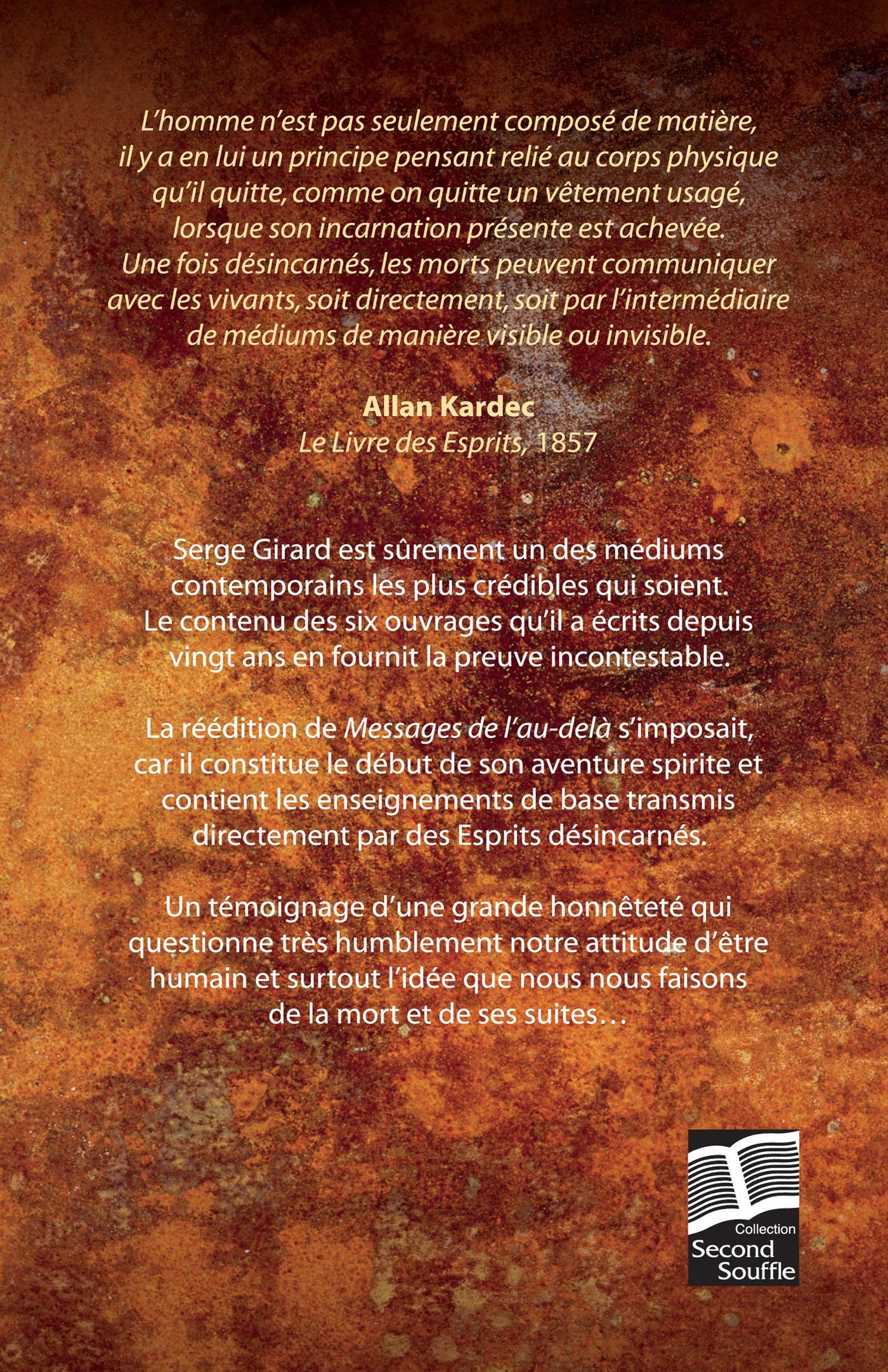 Il y a plus de vingt ans, le Jonquiérois Serge Girard s'est présenté aux Éditions JCL, comme tous les autres auteurs, avec son manuscrit sous le bras et le cœur plein d'espoir. Une cinquantaine d'esprits, disait-il, l'avaient aidé et inspiré à rendre à terme ce travail sérieux de réflexion.Se pourrait-il que?Les morts sont silencieux, c'est bien connu. Très peu d'entre eux sont revenus sur la Terre, en chair et en os, pour nous raconter exactement ce qui se passe dans l'au-delà. Cependant, depuis la nuit des temps, plusieurs Esprits désincarnés ont confié des témoignages très intéressants aux médiums qui possédaient le don de les capter.Serge Girard est un de ces médiums que les Esprits ont utilisés sciemment comme intermédiaire, afin de livrer à tous leurs points de vue sur plusieurs aspects de la vie humaine et terrestre. Mieux encore, ces habitants de l'au-delà ont raconté avec précision quels individus étaient-ils sur la Terre, et ce qui leur est arrivé dans l'après-mort.Remise en questionMaintenant disponible en format semi-poche, Messages de l'au-delà constitue un témoignage d'une grande honnêteté. Ce livre questionne très humblement nos attitudes en tant qu'être humain et surtout nous fait réfléchir sur l'idée que nous nous faisons de la mort et de ses suites.