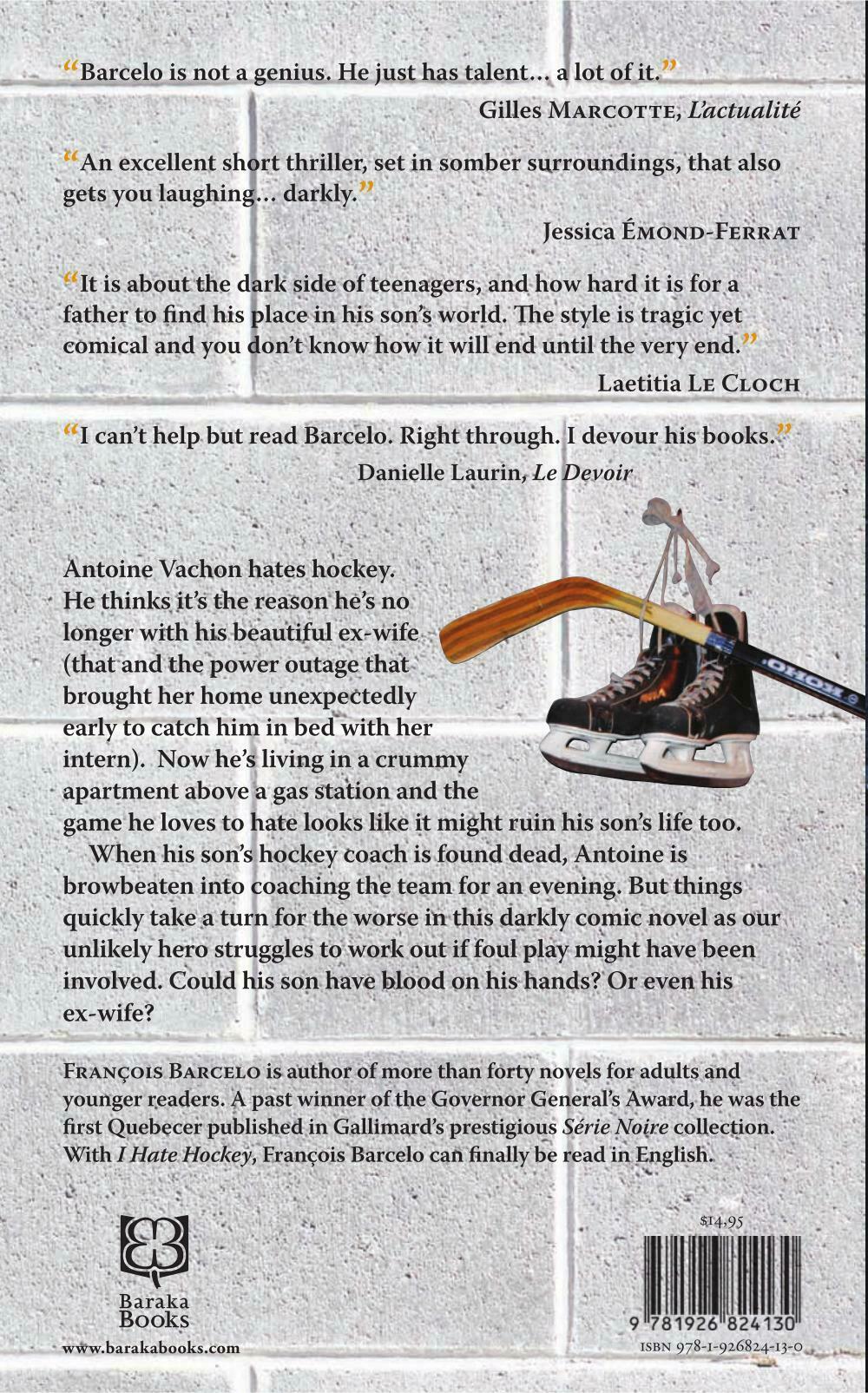 “I hate hockey!” is the first and last sentence in this novel that offers a great take on our love-hate relationship with hockey. Narrator Antoine Vachon blames the game for killing his marriage with his beautiful ex-wife (well, that and the power outage that brought her home unexpectedly to find him in bed with her intern). But hockey is a pretext for unlikely adventure in this sardonic roman noir that at times flirts with the outrageous.Antoine is a total loser living in a pitiful bachelor apartment after he has lost his wife and his job as a car salesman. When his son’s hockey coach is found dead, he is browbeaten into coaching the team for one night only. He makes it through the game (to great comic effect), but things take a turn for the worse when the team bus stops at a motel after the game. Who killed the former coach and why? Was Antoine’s son involved? Or his ex-wife? The late coach was close to his players, perhaps too close… And why is Antoine unable to communicate with his son? François Barcelo’s humour and brilliant story telling is finally available in English. I Hate Hockey reads quickly, but is meticulously stitched together. Though subtle signposts are present throughout, every development comes as a total surprise.