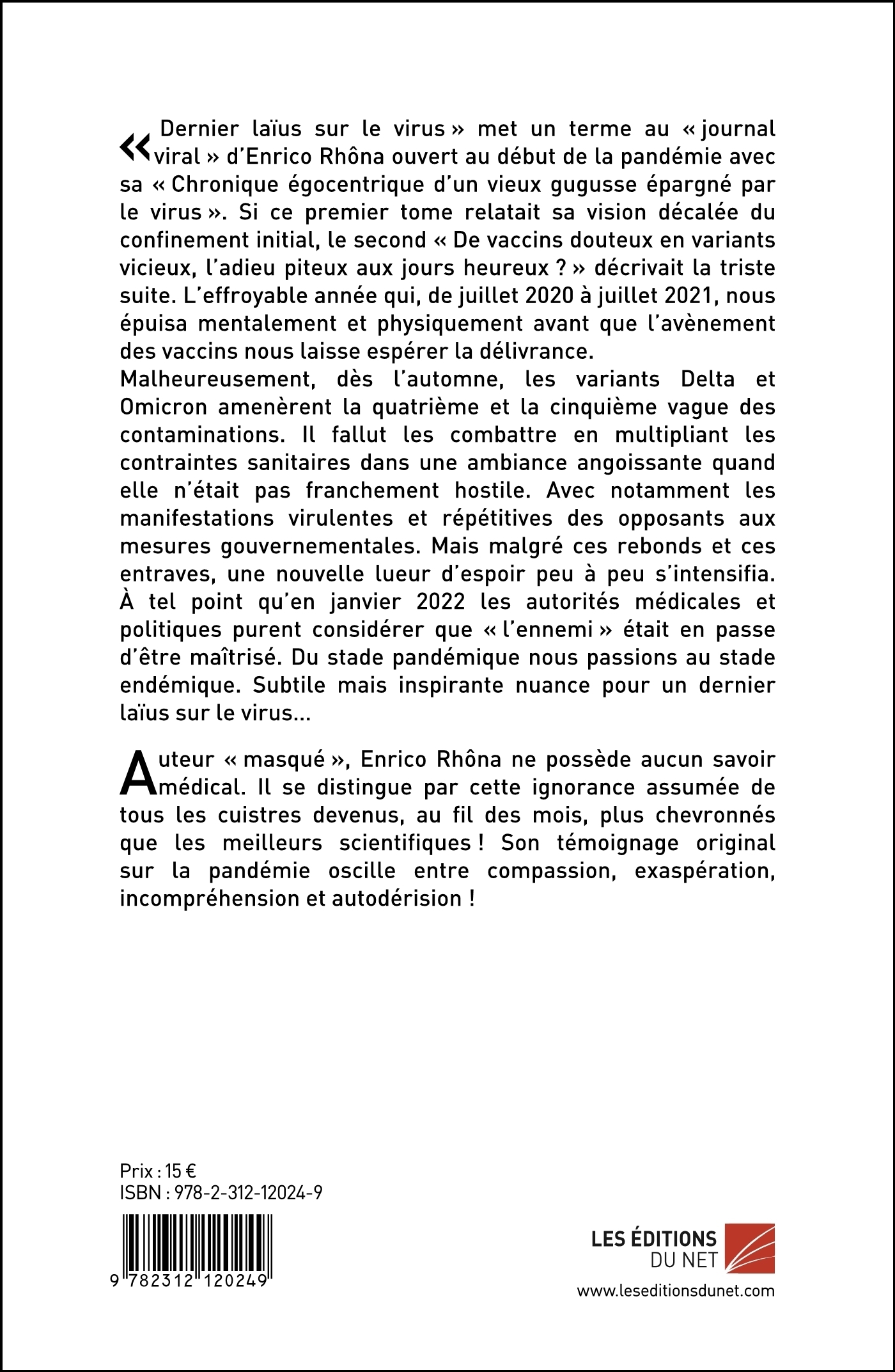 « Dernier laïus sur le virus » met un terme au « journal viral » d’Enrico Rhôna ouvert au début de la pandémie avec sa « Chronique égocentrique d’un vieux gugusse épargné par le virus ». Si ce premier tome relatait sa vision décalée du confinement initial, le second « De vaccins douteux en variants vicieux, l’adieu piteux aux jours heureux ? » décrivait la triste suite. L’effroyable année qui, de juillet 2020 à juillet 2021, nous épuisa mentalement et physiquement avant que l’avènement des vaccins nous laisse espérer la délivrance.Malheureusement, dès l’automne, les variants Delta et Omicron amenèrent la quatrième et la cinquième vague des contaminations. Il fallut les combattre en multipliant les contraintes sanitaires dans une ambiance angoissante quand elle n’était pas franchement hostile. Avec notamment les manifestations virulentes et répétitives des opposants aux mesures gouvernementales. Mais malgré ces rebonds et ces entraves, une nouvelle lueur d’espoir peu à peu s’intensifia. À tel point qu’en janvier 2022 les autorités médicales et politiques purent considérer que « l’ennemi » était en passe d’être maîtrisé. Du stade pandémique nous passions au stade endémique. Subtile mais inspirante nuance pour un dernier laïus sur le virus…