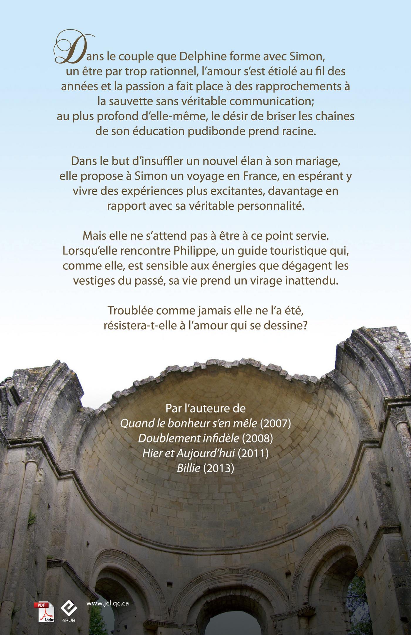 Delphine et Simon, mariés depuis plus de 20 ans, partent en voyage en France pour faire le point sur leur couple, après le départ de la maison de leur seul enfant. Butinant d'un site touristique à l'autre, ils font la rencontre de Philippe, un guide touristique fort compétent que Delphine trouve immédiatement séduisant. Les Québécois en viennent à faire la connaissance de sa femme Sonia, une bombe d'énergie et de bonne humeur. Or, la franche amitié qui les réunira tous les quatre ne pourra pas empêcher l'éclosion d'une incontrôlable passion amoureuse entre Philippe et Delphine. Cette dernière est à la fois grisée et effrayée par ce qui lui arrive. Après avoir longtemps revêtu une apparence de bienséance rigide qui ne correspond plus aujourd'hui à ce qu'elle est, l'insouciance perdue de sa jeunesse la rattrapera-t-elle et lui fera-t-elle redécouvrir la passion d'un premier amour d'adolescent?Ce cinquième roman de Chantale Côté chez JCL explore les problèmes de couple, les mensonges, les remords, l'abandon et surtout le véritable pardon, celui que l'on s'accorde soi-même.