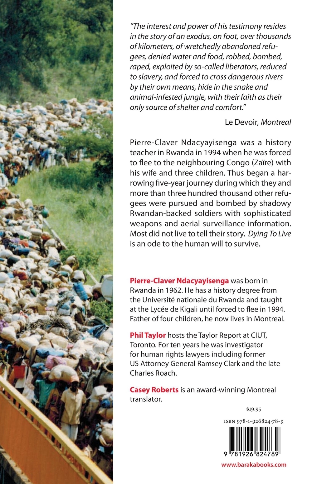 Pierre-Claver Ndacyayisenga was a history teacher in Kigali when he was forced to flee to the neighbouring Congo (Zaïre) with his wife and three children. Thus began a harrowing five-year voyage of 9781926824789 low ressurvival during which they travelled thousands of kilometers on foot from one refugee camp to another. Lacking food and water, they were often robbed, sometimes raped but were constantly pursued and bombed by shadowy Rwandan-backed armed soldiers with sophisticated weapons and aerial surveillance information. He and his family were among the more than three hundred thousand refugees who, for the most part, did not survive to tell their story.Dying To Live is an ode to the human capacity to survive against all odds. Pierre-Claver Ndacyayisenga brilliantly and touchingly tells a story that has been silenced for too long. It will help restore the humanity and the right to mourn to hundreds of thousands of Rwandans dispersed throughout the world.