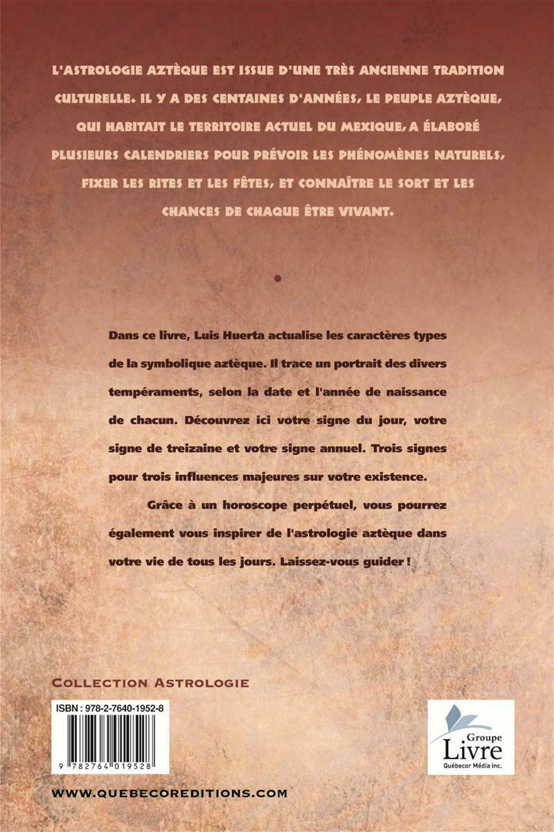 Connaître son signe et découvrir son horoscope quotidien perpetual .. ..L'astrologie aztèque est issue d'une très ancienne tradition culturelle. Il y a des centaines d'années, le peuple aztèque, qui habitait le territoire actuel du Mexique, a élaboré plusieurs calendriers pour prévoir les phénomènes naturels, fixer les rites et les fêtes, et connaître le sort et les chances de chaque être vivant. .. ..Dans ce livre, Luis Huerta actualise les caractères types de la symbolique aztèque. Il trace un portrait des divers tempéraments, selon la date et l'année de naissance de chacun. Découvrez ici votre signe du jour, votre signe de treizaine et votre signe annuel. Trois signes pour trois influences majeures sur votre existence. .. ..Grâce à un horoscope perpétuel, vous pourrez également vous inspirer de l'astrologie aztèque dans votre vie de tous les jours. Laissez-vous guider !