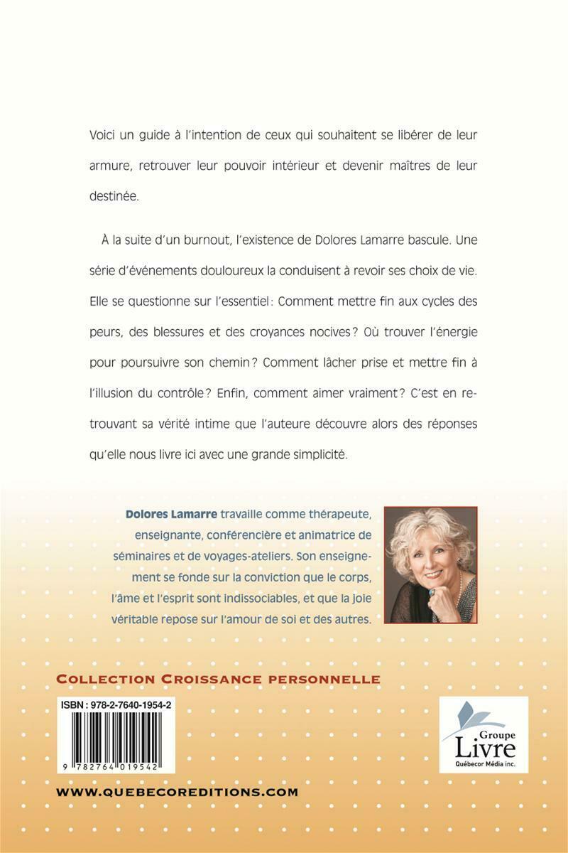 ..À la suite d'un burnout, l'existence de Dolores Lamarre bascule. Une série d'événements douloureux la conduisent à revoir ses choix de vie. Elle se questionne sur l'essentiel: Comment mettre fin aux cycles des peurs, des blessures et des croyances nocives? Où trouver l'énergie pour poursuivre son chemin? Comment lâcher prise et mettre fin à l'illusion du contrôle? Enfin, comment aimer vraiment? C'est en retrouvant sa vérité intime que l'auteure découvre alors des réponses qu'elle nous livre ici avec une grande simplicité.