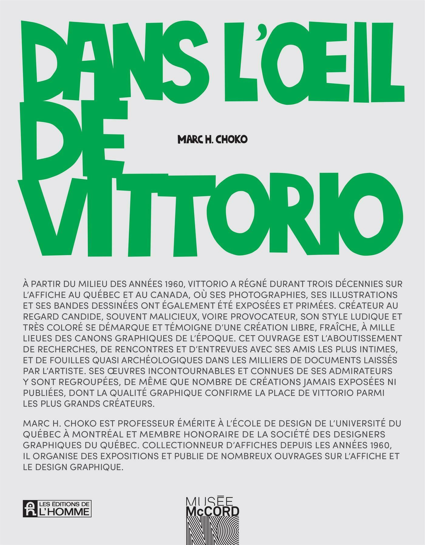 À partir du milieu des années 1960, Vittorio a régné durant trois décennies sur l'affiche au Québec et au Canada, où ses photographies, ses illustrations et ses bandes dessinées ont également été exposées et primées. Créateur au regard candide, souvent malicieux, voire provocateur, son style ludique et très coloré se démarque et témoigne d'une création libre, fraîche, à mille lieues des canons graphiques de l'époque. Cet ouvrage est l'aboutissement de recherches, de rencontres et d'entrevues avec ses amis les plus intimes, et de fouilles quasi archéologiques dans les milliers de documents laissés par l'artiste. Ses œuvres incontournables et connues de ses admirateurs y sont regroupées, de même que nombre de créations jamais exposées ni publiées, dont la qualité graphique confirme la place de Vittorio parmi les plus grands créateurs.