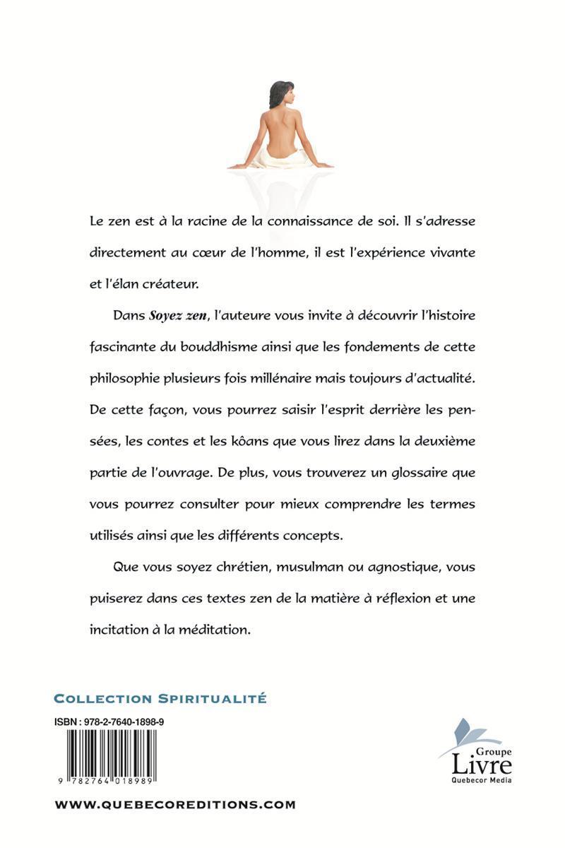 Dans Soyez zen, l'auteure vous invite à découvrir l'histoire fascinante du bouddhisme ainsi que les fondements de cette philosophie plusieurs fois millénaire mais toujours d'actualité. De cette façon, vous pourrez saisir l'esprit derrière les pensées, les contes et les kôans que vous lirez dans la deuxième partie de l'ouvrage. De plus, vous trouverez un glossaire que vous pourrez consulter pour mieux comprendre les termes utilisés ainsi que les différents concepts.