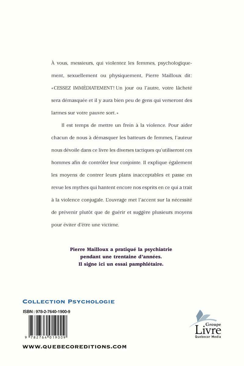 ..Il est temps de mettre un frein à la violence. Pour aider chacun de nous à démasquer les batteurs de femmes, l'auteur nous dévoile dans ce livre les diverses tactiques qu'utiliseront ces hommes afin de contrôler leur conjointe. Il explique également les moyens de contrer leurs plans inacceptables et passe en revue les mythes qui hantent encore nos esprits en ce qui a trait à la violence conjugale. L'ouvrage met l'accent sur la nécessité de prévenir plutôt que de guérir et suggère plusieurs moyens pour éviter d'être une victime.