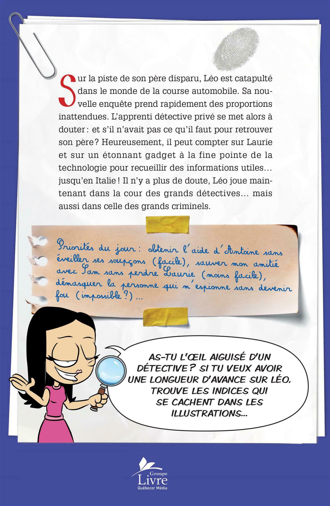 Sur la piste de son père disparu, Léo est catapulté dans le monde de la course automobile. Sa nouvelle enquête prend rapidement des proportions inattendues. L'apprenti détective privé se met alors à douter: et s'il n'avait pas ce qu'il faut pour retrouver son père? Heureusement, il peut compter sur Laurie et sur un étonnant gadget à la fine pointe de la technologie pour recueillir des informations utiles… jusqu'en Italie! Il n'y a plus de doute, Léo joue maintenant dans la cour des grands détectives… mais aussi dans celle des grands criminels.