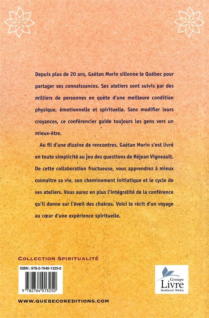 Depuis plus de 20 ans, Gaétan Morin sillonne le Québec pour partager ses connaissances. Ses ateliers sont suivis par des milliers de personnes en quête d'une meilleure condition physique, émotionnelle et spirituelle. Sans modifier leurs croyances, ce conférencier guide toujours les gens vers un mieux-être. Au fil d'une dizaine de rencontres, Gaétan Morin s'est livré en toute simplicité au jeu des questions de Réjean Vigneault. De cette collaboration fructueuse, vous apprendrez à mieux connaître sa vie, son cheminement initiatique et le cycle de ses ateliers. Vous aurez en plus l'intégralité de la conférence qu'il donne sur l'éveil des chakras. Voici le récit d'un voyage au cœur d'une expérience spirituelle.