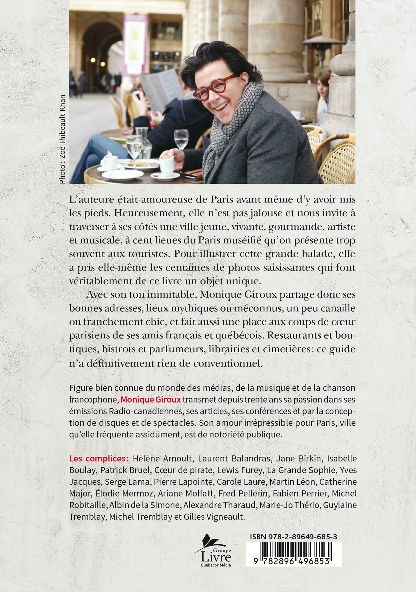 .Avec son ton inimitable, Monique Giroux partage donc ses bonnes adresses, lieux mythiques ou méconnus, un peu canaille ou franchement chic, et fait aussi une place aux coups de cœur parisiens de ses amis français et québécois. Restaurants et boutiques, bistrots et parfumeurs, librairies et cimetières : ce guide n'a définitivement rien de conventionnel!