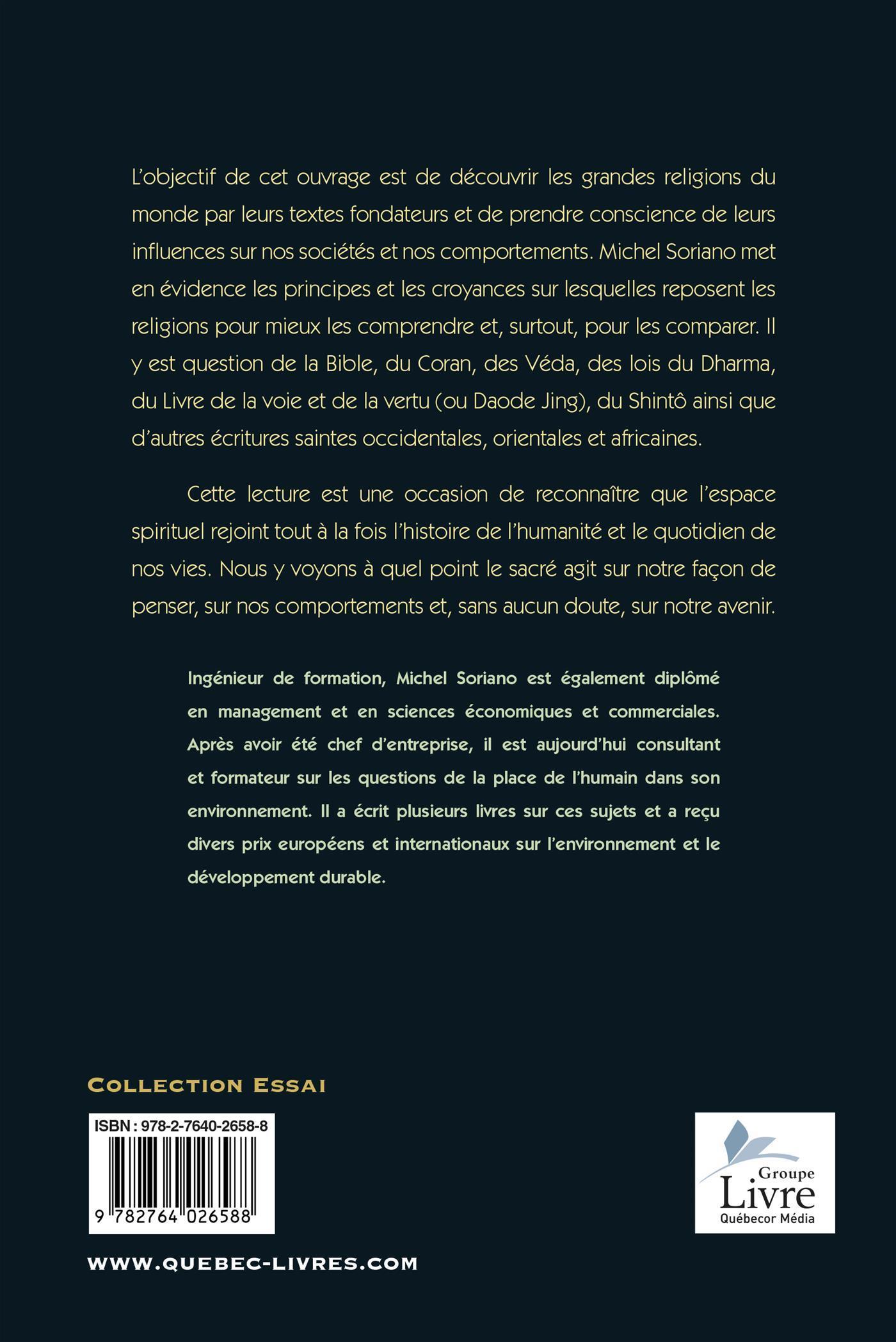 L'objectif de cet ouvrage est de découvrir les grandes religions du monde par leurs textes fondateurs et de prendre conscience de leurs influences sur nos sociétés et nos comportements. Michel Soriano met en évidence les principes et les croyances sur lesquelles reposent les religions pour mieux les comprendre et, surtout, pour les comparer. Il y est question de la Bible, du Coran, des Véda, des lois du Dharma, du Livre de la voie et de la vertu (ou Daode jing), du Shintô ainsi que d'autres écritures saintes occidentales, orientales et africaines.
