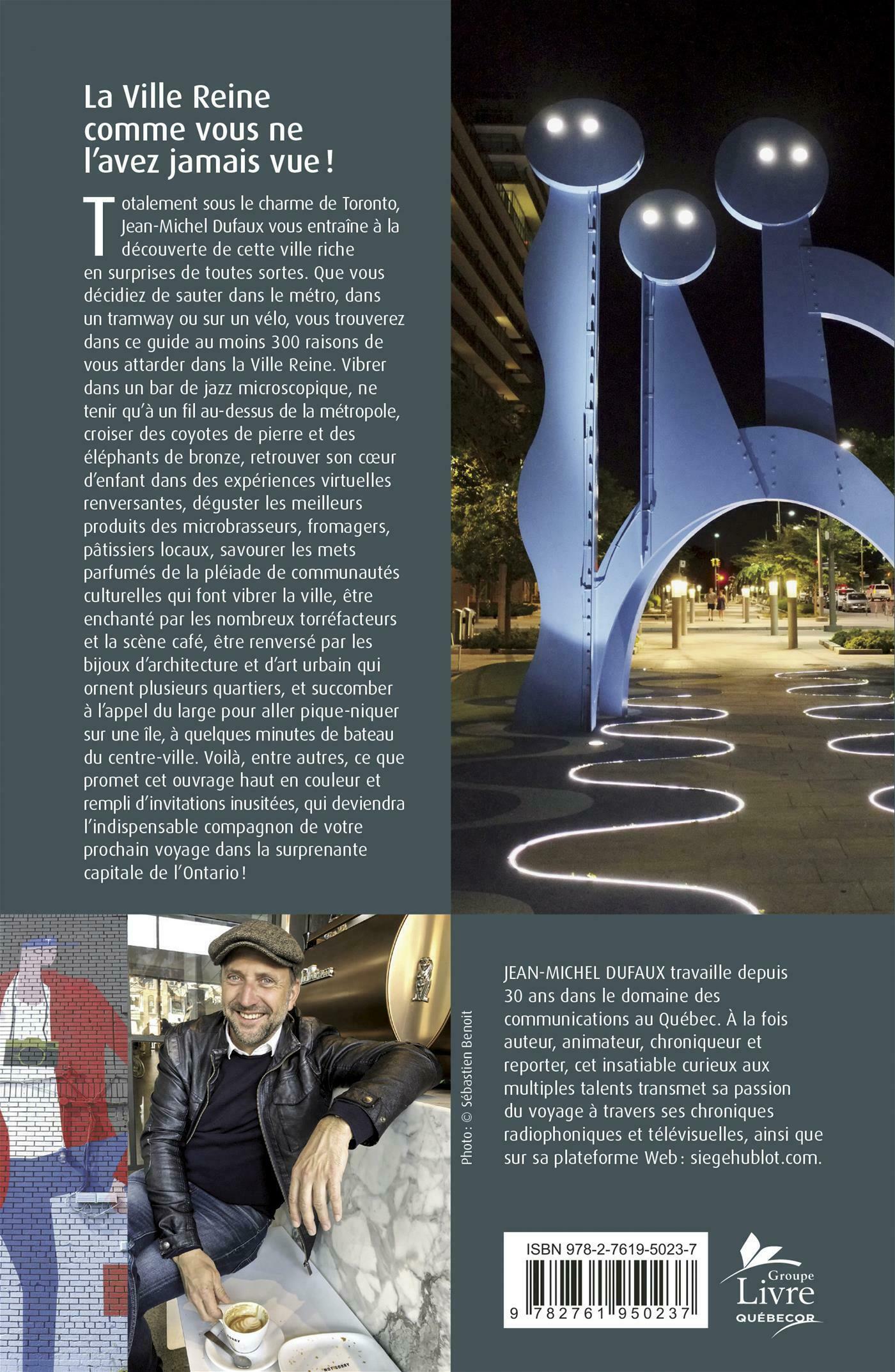 La Ville Reine comme vous ne l'avez jamais vue! . .Totalement sous le charme de Toronto, Jean-Michel Dufaux vous entraîne à la découverte de cette ville riche en surprises de toutes sortes. Que vous décidiez de sauter dans le métro, dans un tramway ou sur un vélo, vous trouverez dans ce guide au moins 300 raisons de vous attarder dans la Ville Reine. . .Vibrer dans un bar de jazz microscopique, ne tenir qu'à un fil au-dessus de la métropole, croiser des coyotes de pierre et des éléphants de bronze, retrouver son cœur d'enfant dans des expériences virtuelles renversantes, déguster les meilleurs produits des microbrasseurs, fromagers, pâtissiers locaux, savourer les mets parfumés de la pléiade de communautés culturelles qui font vibrer la ville, être enchanté par les nombreux torréfacteurs et la scène café, être renversé par les bijoux d'architecture et d'art urbain qui ornent plusieurs quartiers, et succomber à l'appel du large pour aller pique-niquer sur une île, à quelques minutes de bateau du centre-ville. Voilà, entre autres, ce que promet cet ouvrage haut en couleur et rempli d'invitations inusitées, qui deviendra l'indispensable compagnon de votre prochain voyage dans la surprenante capitale de l'Ontario!