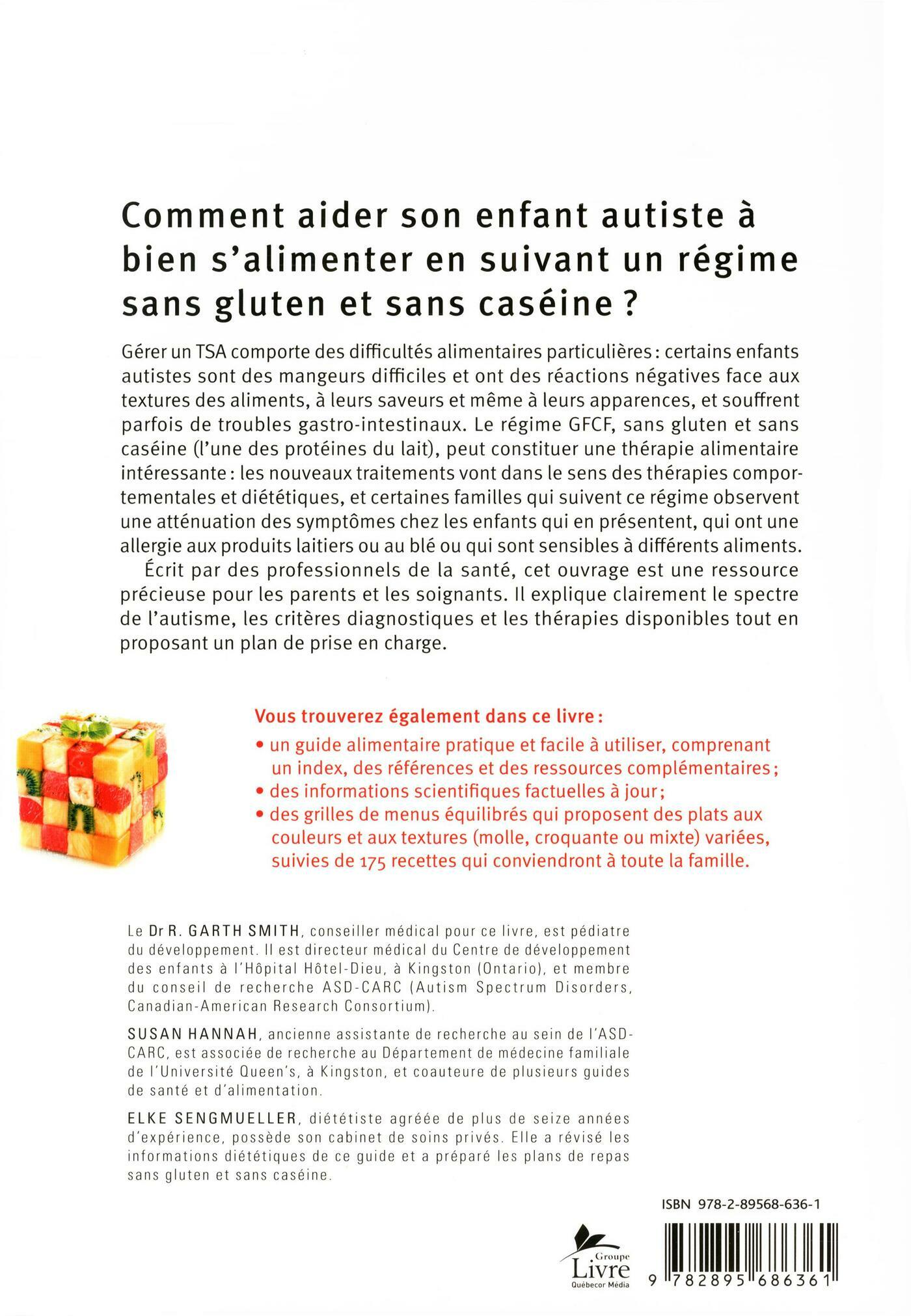 Traduit par Pénélope Bourque. . . .Gérer un TSA comporte des difficultés alimentaires particulières : certains enfants autistes sont des mangeurs difficiles et ont des réactions négatives face aux textures des aliments, à leurs saveurs et même à leurs apparences, et souffrent parfois de troubles gastro-intestinaux. Le régime GFCF, sans gluten et sans caséine (l'une des protéines du lait) peut constituer une thérapie alimentaire intéressante : si les recherches ne sont pas concluantes, les nouveaux traitements vont dans le sens des thérapies comportementales et diététiques et certaines familles qui suivent ce régime observent une atténuation des symptômes chez les enfants qui en présentent, qui ont une allergie aux produits laitiers ou au blé ou qui sont sensibles à différents aliments. . .Écrit par des professionnels de la santé, cet ouvrage est une ressource précieuse pour les parents et les soignants. Il explique clairement le spectre de l'autisme, les critères diagnostiques et les thérapies disponibles tout en proposant un plan de prise en charge. . . .Vous trouverez également dans ce livre : . .• un guide alimentaire pratique et facile à utiliser, comprenant un index, des références et des ressources complémentaires ; .• des informations scientifiques factuelles à jour ; .• des grilles de menus équilibrés qui proposent des plats aux couleurs et aux textures (molle, croquante ou mixte) variées, suivies de 175 recettes qui conviendront à toute la famille.