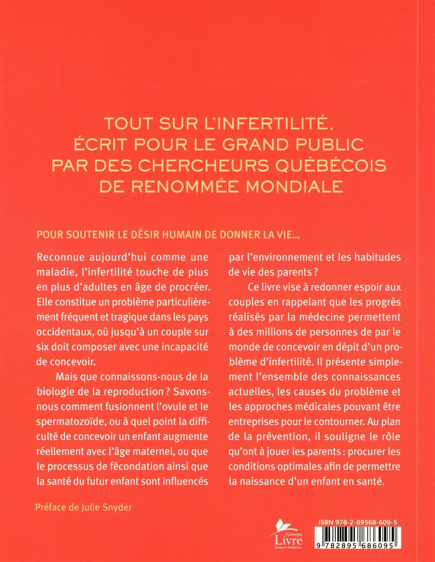 ..De facture soignée, illustré en couleur avec de nombreux dessins et photos, cet ouvrage de référence présente l'ensemble des connaissances actuelles sur la reproduction ainsi que sur les approches médicales qui peuvent permettre de prévenir et de traiter l'infertilité. Écrit par des spécialistes québécois à la fine pointe des recherches, il informe et rassure.