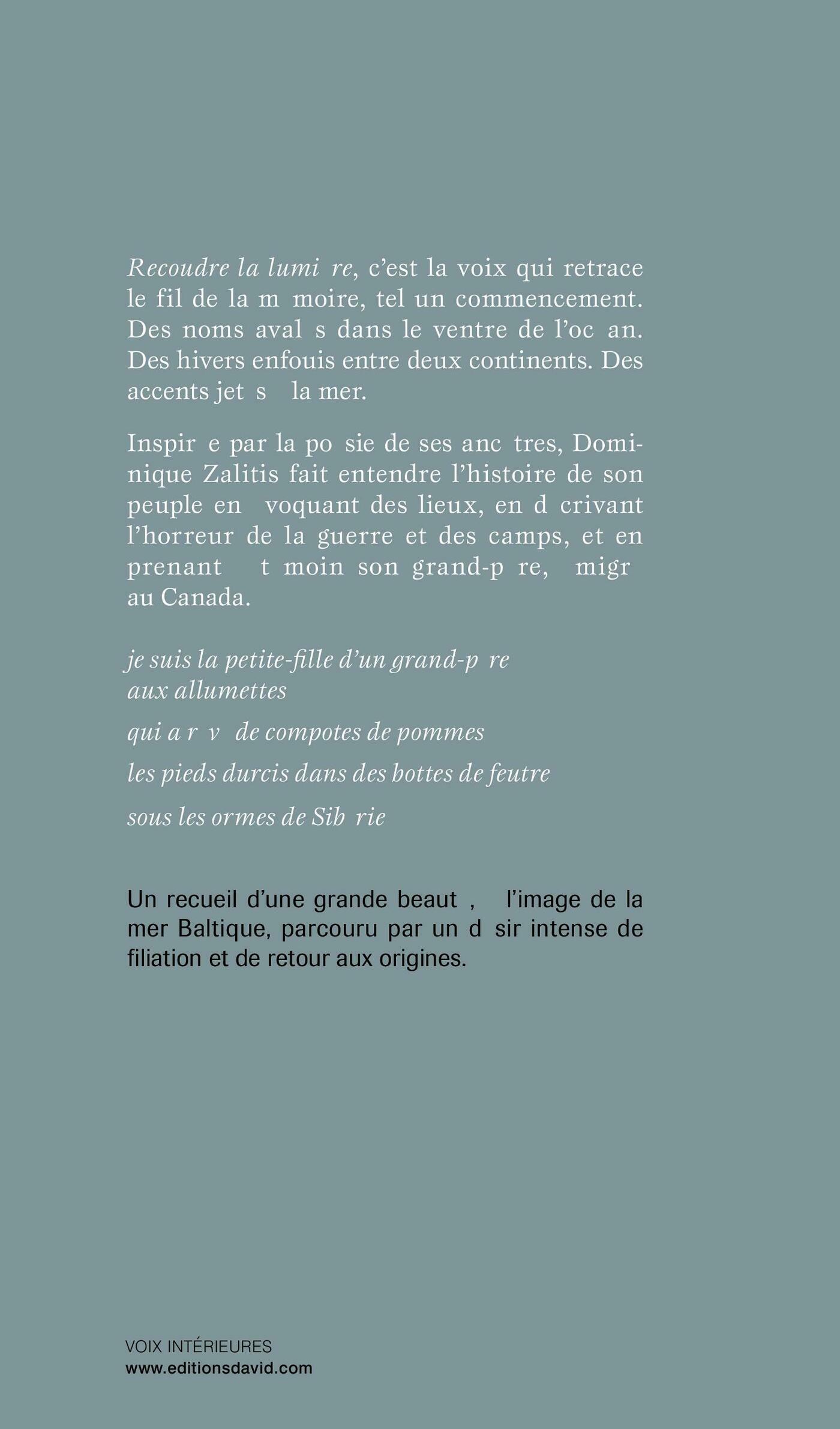 Dans Recoudre la lumière, la poète fait vivre la mémoire d’une Lettonie qui respire en elle, le pays de ses origines qu’elle désire retrouver d’abord, puis se réapproprier par l’écriture. Inspirée par la poésie de ses ancêtres, elle fait entendre l’histoire de son peuple en évoquant des lieux, en datant des événements, en décrivant l’horreur de la guerre et des camps, l’envahissement par l’URSS, mais surtout elle prend à témoin l’histoire de son grand-père qui a réussi à émigrer au Canada. À la fin du recueil, elle s’écrie « Je rentre à la maison » après cette longue traversée qui a lui a permis de ressouder les traits épars de son existence. Un recueil d’une grande beauté, à l’image de la mer Baltique, où s’affirment la nostalgie de l’exil et le désir d’un royaume à reconquérir.