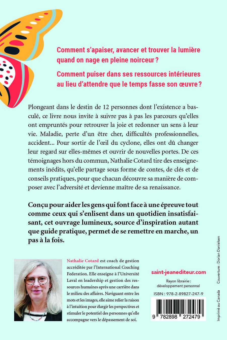 Comment s’apaiser, avancer et trouver la lumière quand on nage en pleine noirceur ?Comment puiser dans ses ressources intérieures au lieu d’attendre que le temps fasse son œuvre ?Plongeant dans le destin de 12 personnes dont l’existence a basculé, ce livre nous invite à suivre pas à pas les parcours qu’elles ont empruntés pour retrouver la joie et redonner un sens à leur vie. Maladie, perte d’un être cher, difficultés professionnelles, accident… Pour sortir de l’œil du cyclone, elles ont dû changer leur regard sur elles-mêmes et ouvrir de nouvelles portes. De ces témoignages hors du commun, Nathalie Cotard tire des enseignements inédits, qu’elle partage sous forme de contes, de clés et de conseils pratiques, pour que chacun découvre sa manière de composer avec l’adversité et devienne maître de sa renaissance.Conçu pour aider les gens qui font face à une épreuve tout comme ceux qui s’enlisent dans un quotidien insatisfaisant, cet ouvrage lumineux, source d’inspiration autant que guide pratique, permet de se remettre en marche, un pas à la fois.