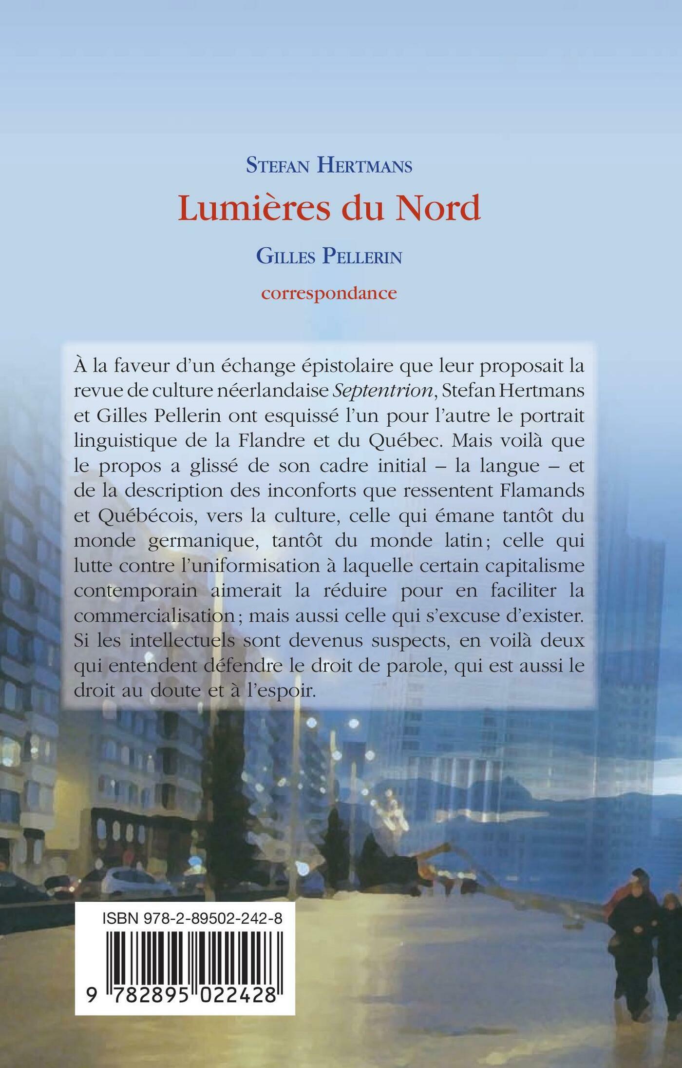 À la faveur d’un échange épistolaire que leur proposait la revue de culture néerlandaise « Septentrion », Stefan Hertmans et Gilles Pellerin ont esquissé l’un pour l’autre le portrait linguistique de la Flandre et du Québec. Mais voilà que le propos a glissé de son cadre initial – la langue – et de la description des inconforts que ressentent Flamands et Québécois, vers la culture, celle qui émane tantôt du monde germanique, tantôt du monde latin ; celle qui lutte contre l’uniformisation à laquelle certain capitalisme contemporain aimerait la réduire pour en faciliter la commercialisation ; mais aussi celle qui s’excuse d’exister. Si les intellectuels sont devenus suspects, en voilà deux qui entendent défendre le droit de parole, qui est aussi le droit au doute et à l’espoir.