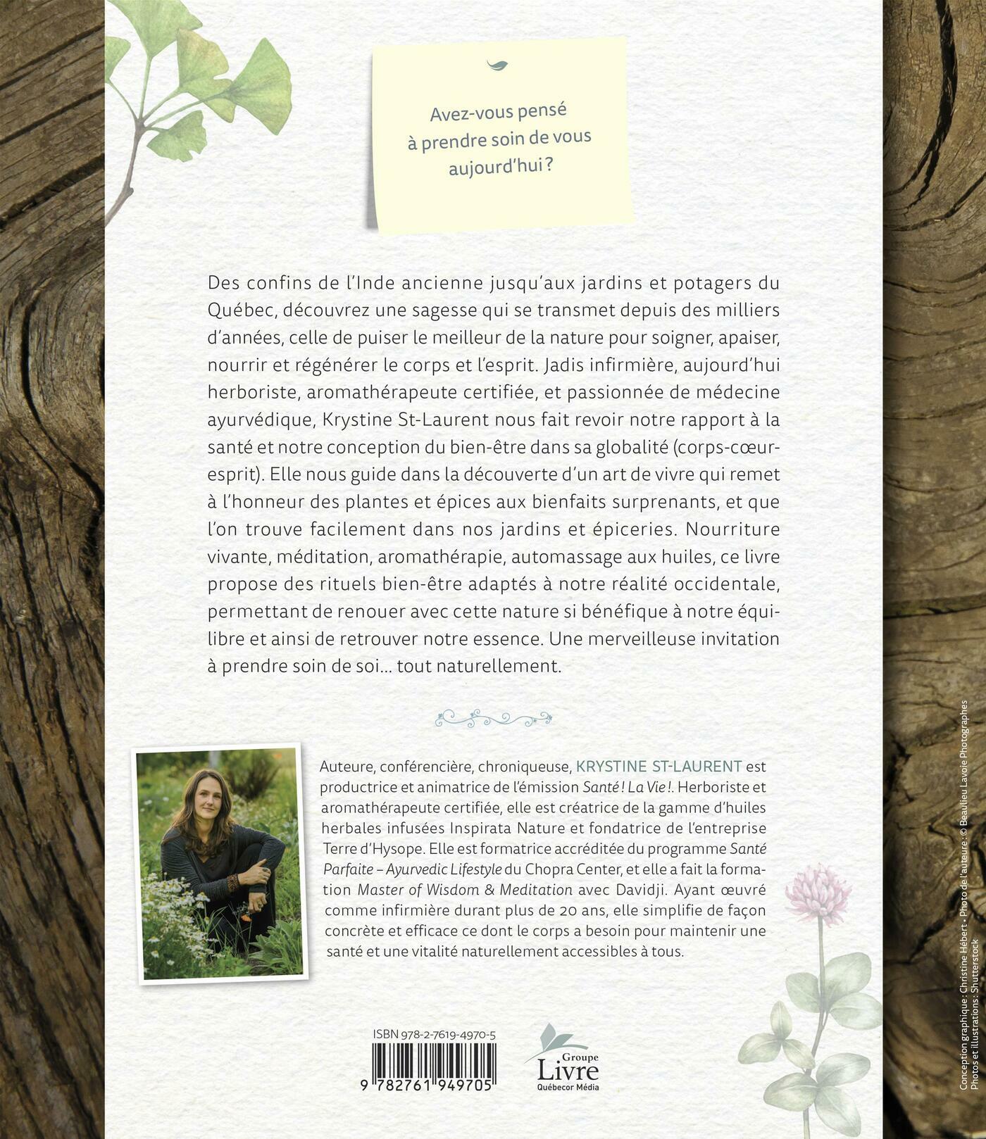 .Jadis infirmière, aujourd'hui herboriste, aromathérapeute certifiée, et passionnée de médecine ayurvédique, Krystine St-Laurent nous fait revoir notre rapport à la santé et notre conception du bien-être dans sa globalité (corps-cœur-esprit).