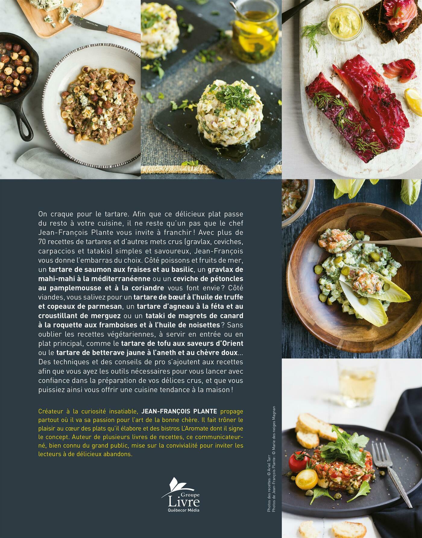 On craque pour le tartare. Afin que ce délicieux plat passe du resto à votre cuisine, il ne reste qu'un pas que le chef Jean-François Plante vous invite à franchir ! Avec plus de 70 recettes de tartares et d'autres mets crus (gravlax, ceviches, carpaccios et tatakis) simples et savoureux, Jean-François vous donne l'embarras du choix. Côté poissons et fruits de mer, un tartare de saumon aux fraises et au basilic, un gravlax de mahi-mahi à la méditerranéenne ou un ceviche de pétoncles au pamplemousse et à la coriandre vous font envie? Côté viandes, vous salivez pour un tartare de boeuf à l'huile de truffe et copeaux de parmesan, un tartare d'agneau à la féta et au croustillant de merguez ou un tataki de magrets de canard à la roquette aux framboises et à l'huile de noisettes? Sans oublier les recettes végétariennes, à servir en entrée ou en plat principal, comme le tartare de tofu aux saveurs d'Orient ou le tartare de betterave jaune à l'aneth et au chèvre doux… Des techniques et des conseils de pro s'ajoutent aux recettes afin que vous ayez les outils nécessaires pour vous lancer avec confiance dans la préparation de vos délices crus, et que vous puissiez ainsi vous offrir une cuisine tendance à la maison!
