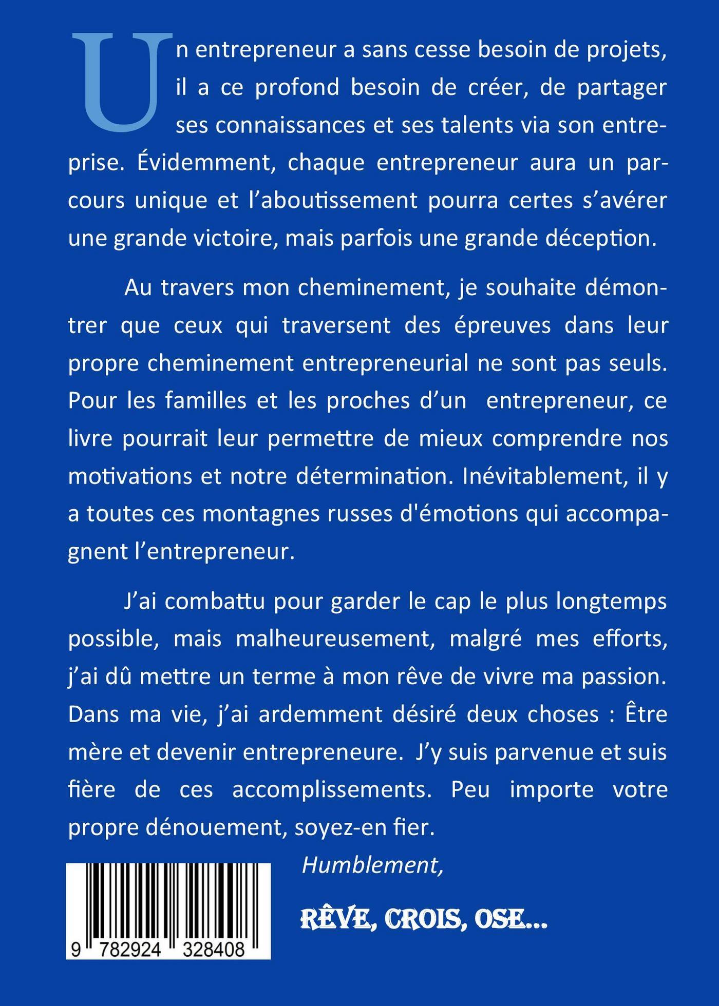 Un entrepreneur a sans cesse besoin de projets, il a ce profond besoin de créer, de partager ses connaissances et ses talents via son entreprise. Évidemment, chaque entrepreneur aura un parcours unique et l’aboutissement pourra certes s’avérer une grande victoire, mais parfois une grande déception.Au travers mon cheminement, je souhaite démontrer que ceux qui traversent des épreuves dans leur propre cheminement entrepreneurial ne sont pas seuls. Pour les familles et les proches d’un entrepreneur, ce livre pourrait leur permettre de mieux comprendre nos motivations et notre détermination. Inévitablement, il y a toutes ces montagnes russes d'émotions qui accompagnent l’entrepreneur. J’ai combattu pour garder le cap le plus longtemps possible, mais malheureusement, malgré mes efforts, j’ai dû mettre un terme à mon rêve de vivre ma passion. Dans ma vie, j’ai ardemment désiré deux choses : Être mère et devenir entrepreneure. J’y suis parvenue et suis fière de ces accomplissements. Peu importe votre propre dénouement, soyez-en fier. Humblement, Rêve, Crois, Ose…