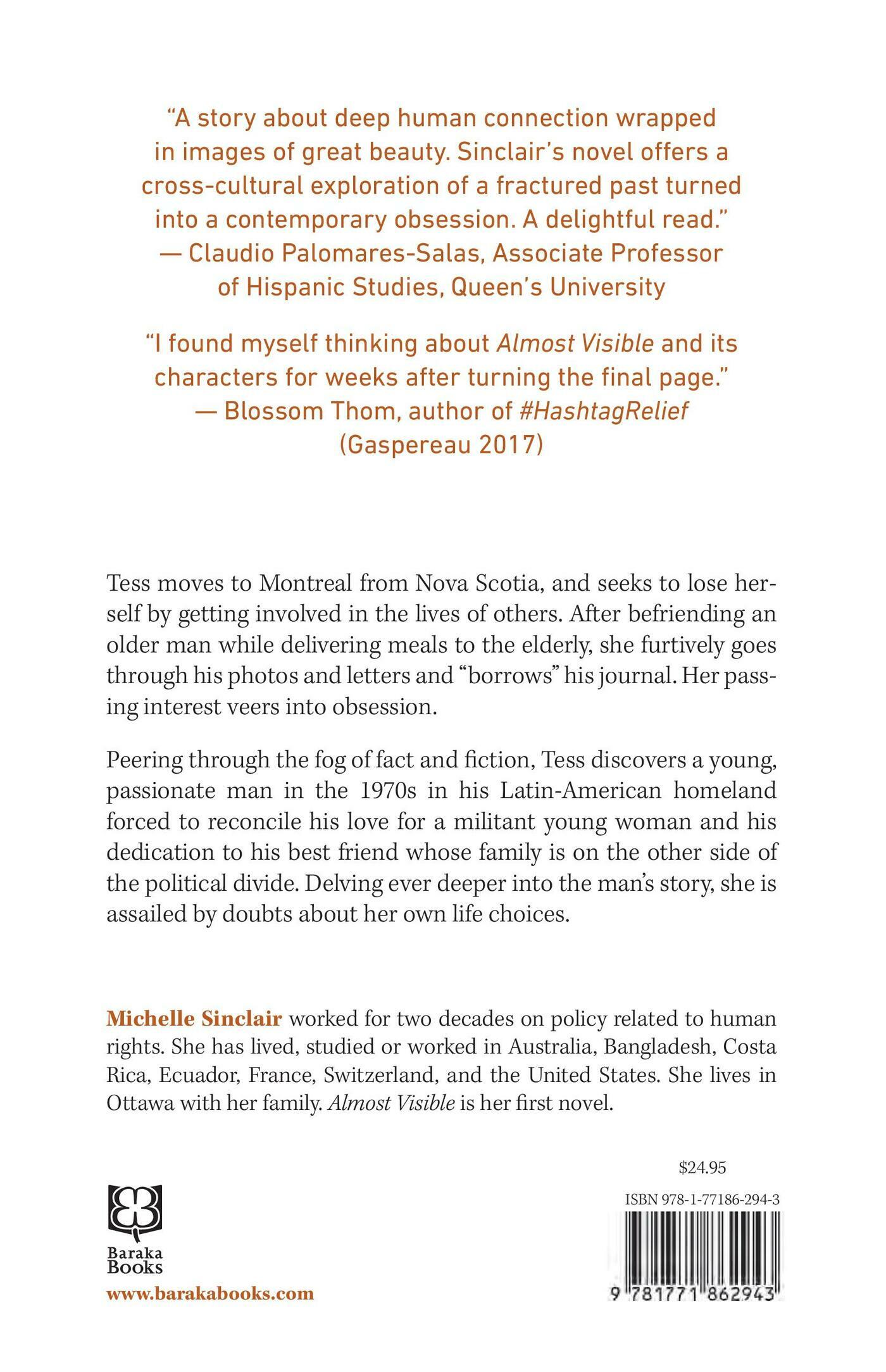 Tess has just moved to Montreal from Nova Scotia, and seeks to lose herself by getting involved in the lives of others. She befriends an older man while delivering meals to the elderly. Her interest in his past veers into obsession after she furtively goes through his photos and letters and “borrows” his journal.Though fact and fiction are blurred, they reveal a man shaken by political polarization and repression in his Latin-American homeland.Tess learns about a young, passionate man in the 1970s forced to reconcile his love for a militant young woman and his dedication to his best friend whose family is on the other side of the political divide. As she delves deeper into the man’s story, she questions her own life choices, emotions and obsessions.Exploring cultural and personal memory, Almost Visible reflects on what can happen when a lonely person intervenes in another person’s life.Michelle SinclairMichelle Sinclair worked for two decades on policy related to human rights. She has lived, studied or worked in Australia, Bangladesh, Costa Rica, Ecuador, France, Switzerland, and the United States. She lives in Ottawa with her family. Almost Visible is her first novel.In the media“Almost Visible is a poignant, time-traversing literary novel about the rewards of daring to involve oneself in a stranger’s pain.” Karen Rigby, Foreword Reviews (Sep/Oct 2022)“There is an intensity in Michelle Sinclair’s writing – depth of insight into each character, each setting and each moment – that draws the reader into the words of her story. (…) Almost Visible is a powerful study in themes of cultural and personal memory … Every word, every moment has a place in her writing. This makes for excellent reading.” Anne Smith-Nochasak, The Miramichi ReaderPraise“A novel that wisely and compassionately explores the self-shattering lines that exist between altruism and betrayal, cynicism and idealism, and the harsh price paid by both sides.” David Adams Richards, Giller and Governor-General award winner“A story about deep human connection wrapped in images of great beauty. Sinclair’s novel offers a cross-cultural exploration of a fractured past turned into a contemporary obsession. A delightful read.” Claudio Palomares-Salas, Associate Professor of Hispanic Studies, Queen’s University“In Almost Visible, Michelle Sinclair takes the reader into the lives of characters on the cusp of adulthood as they navigate their worlds. From Montréal to an unnamed “country in South America” on the verge of a civil war, we see how family secrets impact the lives of the unsuspecting. I found myself thinking about Almost Visible and the book’s characters for weeks after turning the final page—always a sign of a good book.” Blossom Thom, Montreal Poet, author of #HashtagRelief (Gaspereau 2017)