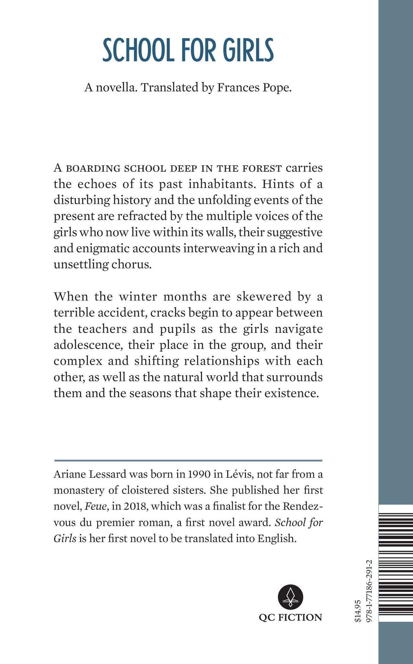 A spooky feminist novella . . .ideal for Halloween!Deep in the forest, a remote boarding school echoes with unspoken stories… A boarding school deep in the forest carries the echoes of its past inhabitants. Hints of a disturbing history and the unfolding events of the present are refracted by the multiple voices of the girls who now live within its walls, their suggestive and enigmatic accounts interweaving in a rich and unsettling chorus.PRAISE FOR SCHOOL FOR GIRLS“A choral piece with gothic undertones. With an impressive multiplicity of forms, this book tackles a wide variety of themes, underpinned by a strong feminist voice.” (Benoît Vanbeselaere, Les Libraires magazine)“A whole troupe of poisonous young girls, neither demonized nor deified, appearing in all the fragile ferocity of adolescence.” (Laurence Perron, Lettres québécoises magazine)“. . . dark, fraught, frightening in places. And one to read in a single sitting.” (Silvia Galipeau, La Presse newspaper)ABOUT THE AUTHORAriane Lessard was born in 1990 in Lévis, not far from a monastery of cloistered sisters. She published her first novel, Feue, in 2018, which was a finalist for the Rendez-vous du premier roman, a first novel award. She also took part in the first residency of L’Hôtel des autrices in 2020, a feminist digital platform created in Berlin during the pandemic, in which she wrote a novel in one month. School for Girls is her first novel to be translated into English.ABOUT THE TRANSLATORFrances Pope is a translator and writer from the UK. She lived in Montreal between 2015 and 2020, where she received her MA in translation studies from Concordia University. Now living in Bristol (UK), she continues to translate in the arts and non-profit sectors, as well as reviewing and writing about electronic music. Frances has two published collections of poetry, Quarters (Ekstasis Editions) and The Brazen Forecast (Cactus Press), both published in 2020.