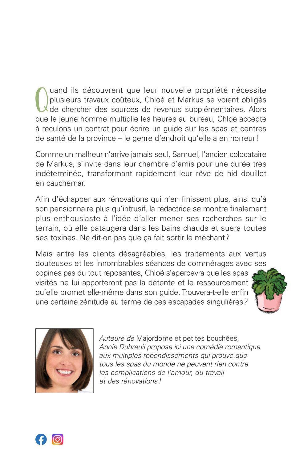 Quand ils découvrent que leur nouvelle propriété nécessite plusieurs travaux coûteux, Chloé et Markus se voient obligés de chercher des sources de revenus supplémentaires. Alors que le jeune homme multiplie les heures au bureau, Chloé accepte à reculons un contrat pour écrire un guide sur les spas et centres de santé de la province – le genre d’endroit qu’elle a en horreur !Comme un malheur n’arrive jamais seul, Samuel, l’ancien colocataire de Markus, s’invite dans leur chambre d’amis pour une durée très indéterminée, transformant rapidement leur rêve de nid douillet en cauchemar.Afin d’échapper aux rénovations qui n’en finissent plus, ainsi qu’à son pensionnaire plus qu’intrusif, la rédactrice se montre finalement plus enthousiaste à l’idée d’aller mener ses recherches sur le terrain, où elle pataugera dans les bains chauds et suera toutes ses toxines. Ne dit-on pas que ça fait sortir le méchant ? Mais entre les clients désagréables, les traitements aux vertus douteuses et les innombrables séances de commérages avec ses copines pas du tout reposantes, Chloé s’apercevra que les spas visités ne lui apporteront pas la détente et le ressourcement qu’elle promet elle-même dans son guide. Trouvera-t-elle enfin une certaine zénitude au terme de ces escapades singulières ?Auteure de Majordome et petites bouchées, Annie Dubreuil propose ici une comédie romantique aux multiples rebondissements qui prouve que tous les spas du monde ne peuvent rien contre les complications de l’amour, du travail et des rénovations !