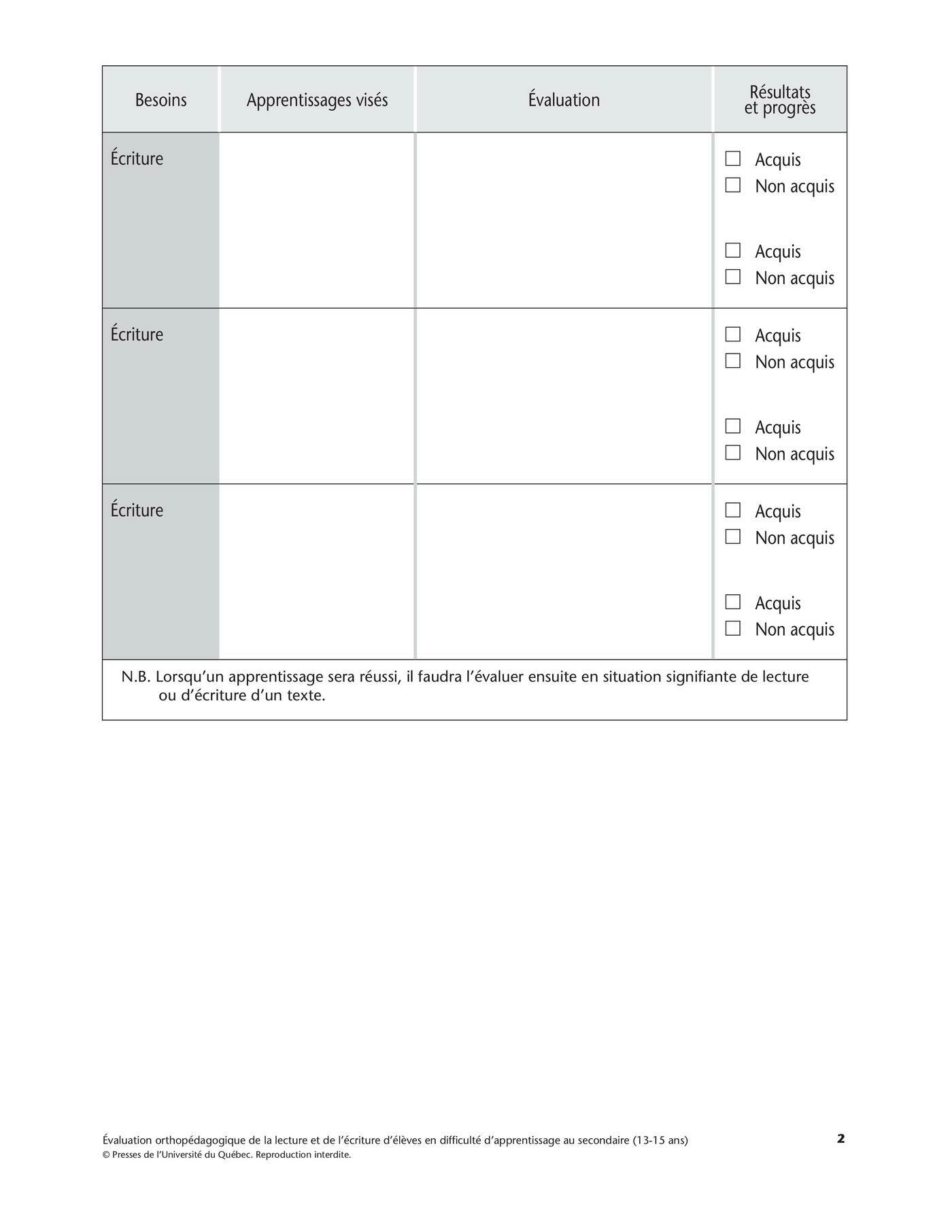 Cet ouvrage a été conçu spécialement pour outiller les enseignant(e)s et les orthopédagogues du secondaire qui interviennent auprès d’élèves ayant une difficulté ou un trouble d’apprentissage. Son originalité tient au fait qu’il permet deux moments d’évaluation, avant et après les interventions.Cet La démarche s’articule selon les étapes suivantes : évaluation initiale, rapport (données sur l’élève, interprétation des résultats, identification des forces et des lacunes et priorisation des besoins), élaboration d’un Plan d’intervention orthopédagogique, période d’interventions, évaluation postinterventions et rapport orthopédagogique, incluant la conclusion et les recommandations.L’outil comporte les documents PDF suivants :· Le « Guide de l’orthopédagogue ». Ce document présente 1) les fondements théoriques qui sous-tendent les évaluations-interventions, et 2) l’explication de chaque activité vécue avec l’élève.· Deux « Cahier de l’orthopédagogue ». Ils permettent l’inscription des résultats qui constitueront le dossier de l’élève. L’orthopédagogue y trouvera également les corrigés des tâches, les informations nécessaires à l’analyse et au calcul des résultats, ainsi que des tableaux permettant de les regrouper.· Deux « Cahier de l’élève »;· Une feuille synthèse qui permet de dresser le bilan des forces et des lacunes de l’élève;· Un document sur les données de l’élève;· Un modèle de Plan d’intervention orthopédagogique.