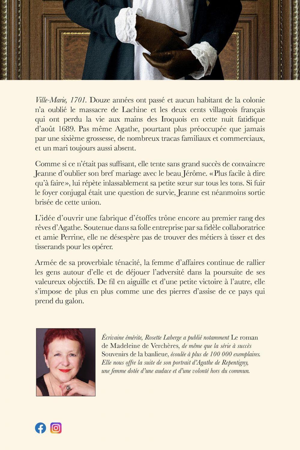 Mai 1701. Douze années ont passé et aucun habitant de la colonie n’a oublié le massacre de Lachine et les deux cents colons et villageois français qui ont perdu la vie aux mains des Iroquois en cette nuit fatidique d’août 1689. Pas même Agathe, pourtant plus occupée que jamais par une sixième grossesse, ses nombreuses préoccupations familiales et commerciales, et un mari toujours aussi absent. Comme si ce n’était pas suffisant, elle tente sans grand succès de convaincre Jeanne d’oublier son bref mariage avec le beau Jérôme. « Plus facile à dire qu’à faire », lui répète inlassablement sa petite soeur sur tous les tons. Si fuir le foyer conjugal était une question de survie, Jeanne est néanmoins sortie brisée de cette union. L’idée d’ouvrir une fabrique d’étoffes à Ville-Marie trône encore au premier rang des rêves qu’Agathe entend réaliser. Soutenue dans sa folle entreprise par sa fidèle collaboratrice et amie Perrine, elle ne désespère pas de trouver des métiers à tisser et des tisserands pour les opérer. À cette époque où la mère-patrie menace de les abandonner, les habitants de Ville-Marie mesurent bien l’importance d’assurer leur autonomie.Agathe, armée de sa proverbiale ténacité, continuera de rallier les gens autour d’elle et de déjouer l’adversité dans la poursuite de ses valeureux objectifs. De fil en aiguille et d’une petite victoire à l’autre, elle s’impose de plus en plus comme une des pierres d’assise de ce pays qui prend du galon.